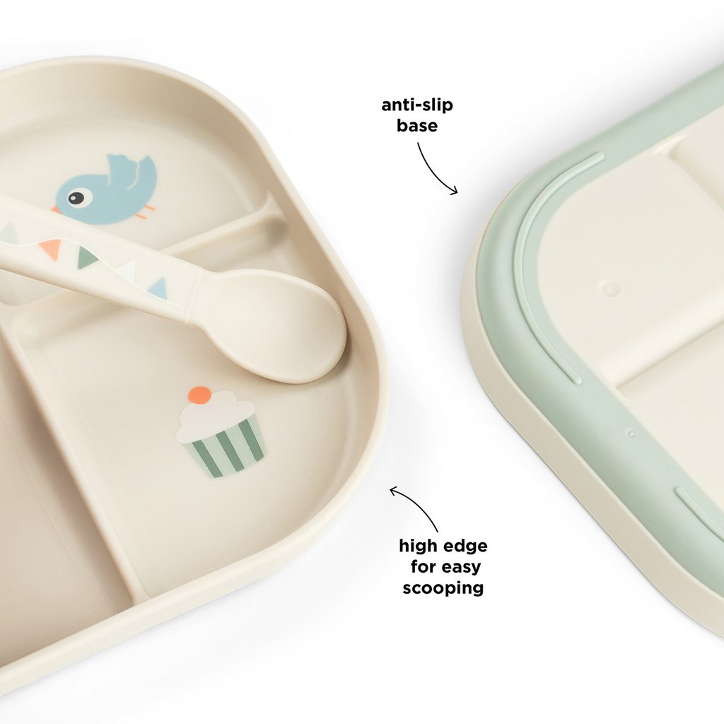 Nechte svého malého gurmána vychutnat jídlo z děleného talíře Foodie. Rozdělení jídel pomáhá dítěti vnímat a objevovat různé chutě a textury. Každá přihrádka udrží jídlo na svém místě, a díky vysokým okrajům bude snadnější pro dítě nabírat jídlo. Protiskluzová základna zajistí, že talíř zůstane pevně na místě. Tento talíř je ideální pro každodenní použití a je vhodný do myčky i mikrovlnné trouby.