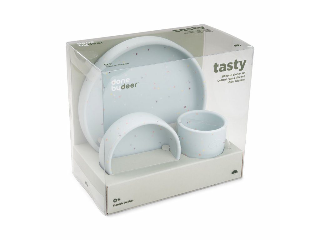 Praktická protiskluzová a snadno uchopitelná silikonová startovací sada obsahuje dětský talíř, misku a mini hrnek.