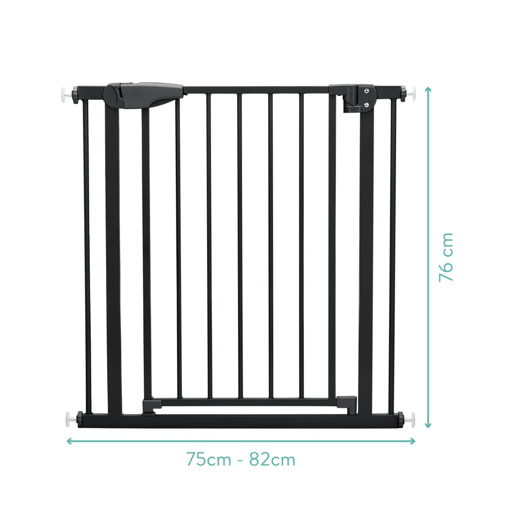 Zábrana je vyrobena z kvalitního kovu, je 76 cm vysoká a padne do standardních dveřních otvorů o šířce 75–82 cm. Díky promyšlené funkci automatického zavírání se branka po průchodu automaticky a bezpečně zavře – ideální, když máte plné ruce nebo spěcháte. Už žádné obavy, zda jste ji správně zavřeli.