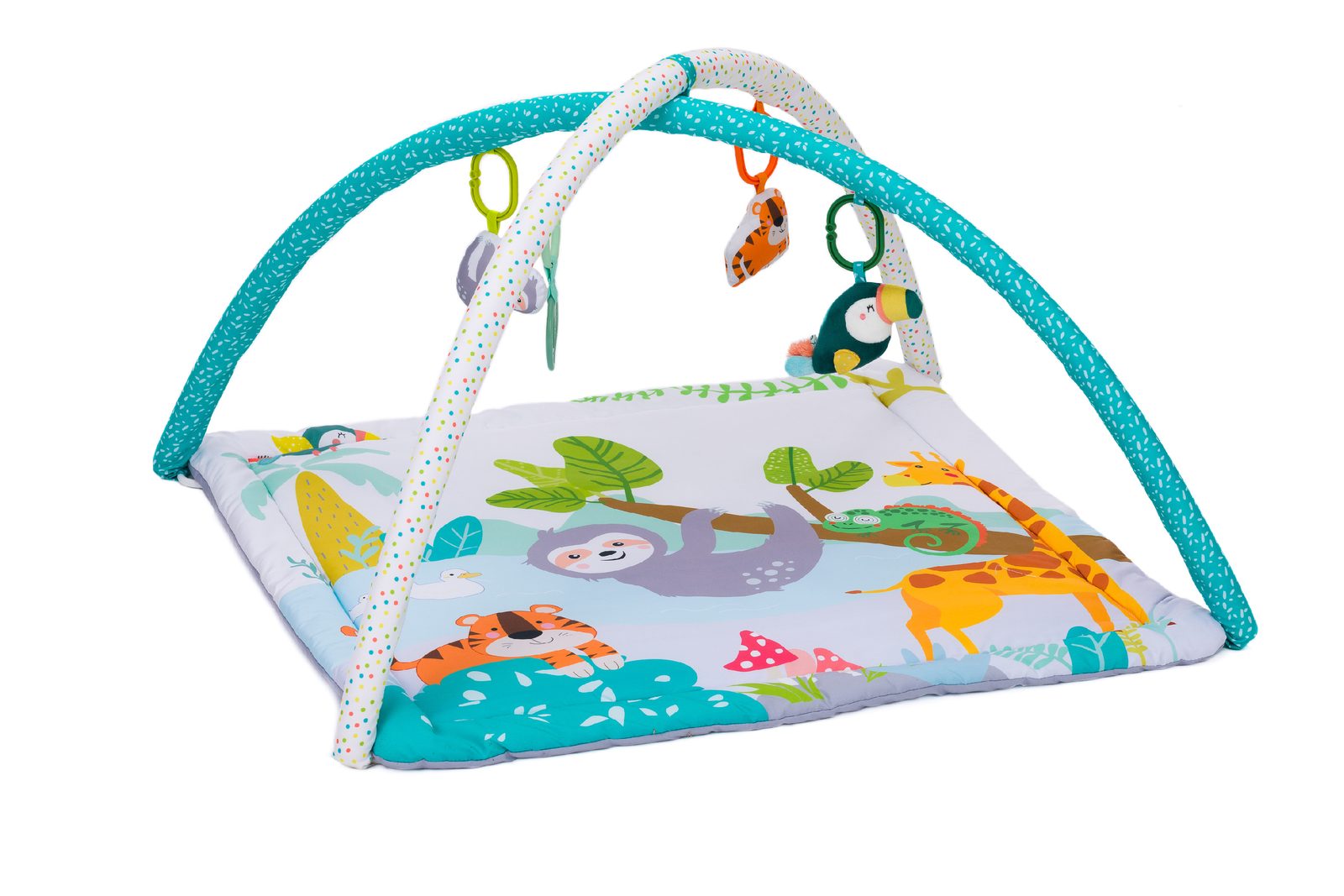 Hrací deka Safari s barevnými hračkami připevněnými k hrazdě nabízí široké možnosti zábavy, které podporují rozvoj koordinace a jemné motoriky vašeho dítěte. Objevování různých interaktivních prvků probouzí zvědavost a podněcuje jeho mentální i fyzický rozvoj. Měkce polstrovaná podlaha poskytuje pohodlí, a jasné barvy hraček přitahují a stimulují zrak malých dětí, což zpříjemňuje čas strávený na dece.