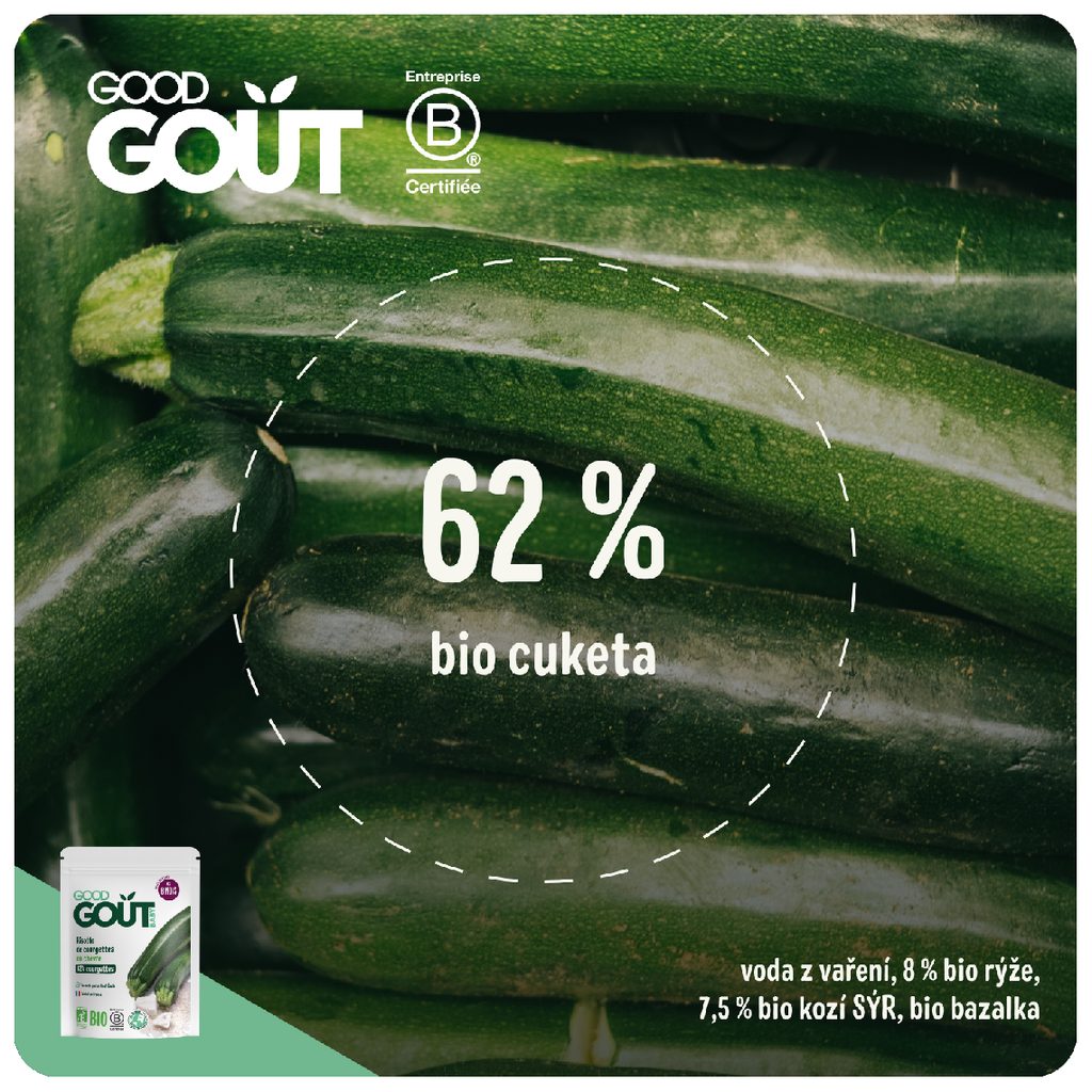 Složení: 60 % bio cuketa, voda z vaření, 9 % bio kozí sýr (laktóza), 8 % bio rýže, bio bazalka. Bez lepku. Obsahuje laktózu.