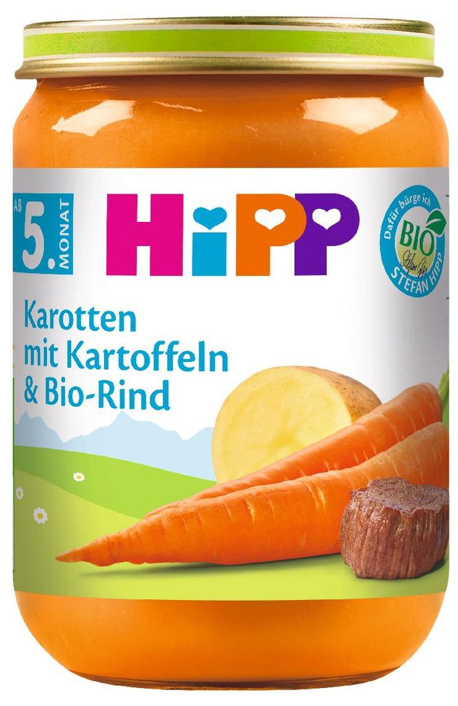 Složení: mrkev* 47 %, brambory* 29 %, voda, hovězí maso* 8,0 %, řepkový olej* 1,3 %.
