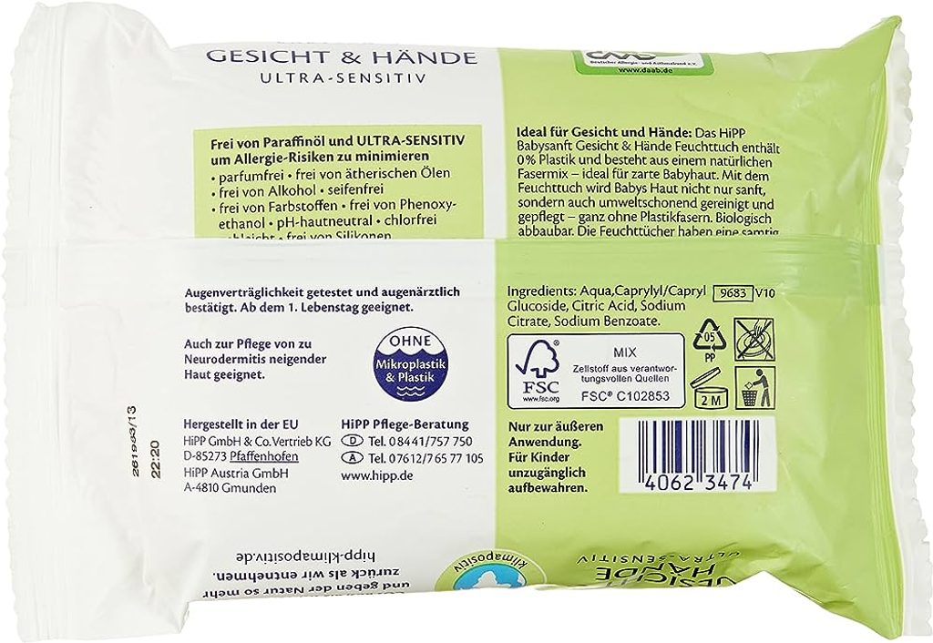 HiPP Babysanft čistící vlhčené ubrousky na obličej a ruce jsou vyrobené ze směsi extra šetrných přírodních vláken, obsahují 99 % vody a jemné mléko a jsou tak ideální na očištění dětského obličeje a rukou. Díky praktickému uzavíratelnému balení nevyschnou a jsou ideální na cesty. Neobsahují mýdlo, udržují přirozené pH pokožky a jsou vhodné od narození, i pro pokožku se sklonem k atopické dermatitidě.