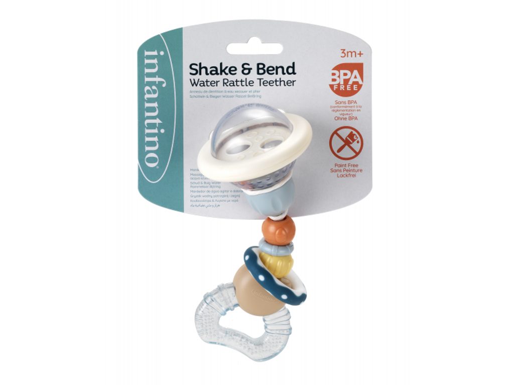Chrastítko s kousátkem Infantino zaujme vaše miminko chrasticími barevnými korálky v průhledné kuličce i ohebnou konstrukcí s posuvnými korálky. Kousátko naplněné vodou je možné ochladit v lednici pro větší úlevu při prořezávání prvních zoubků. Chrastítko podporuje rozvoj jemné motoriky dítěte i jednotlivých smyslů. Vhodné pro děti od 3 měsíců.