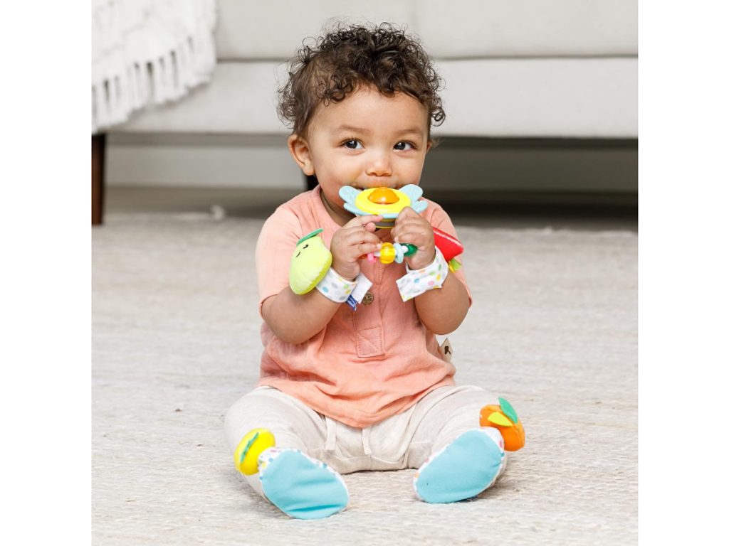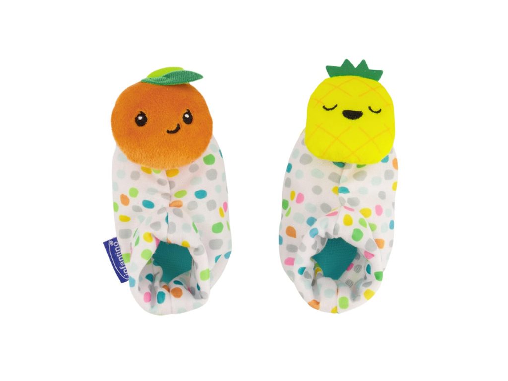 Sada chrastítek pro nejmenší je ideální jako první dárek pro miminko. Chrastítko ve tvaru květiny má tvar pro snadné uchopení. Pozornost dítěte upoutají pohyblivé různobarevné kroužky na rukojeti i chrastící korálky v průhledné kuličce uprostřed hračky. Okvětní plátky květiny slouží jako kousátka, která dítěti pomohou při prořezávání prvních zoubků. Navlékací bačkůrky na nožičky a chrastítka na ruce s veselými obličeji ve tvaru ovoce podněcují rozvoj sluchu, zraku a hmatu dítěte. Dítě při kopání nožičkami i při pohybu ručičkami sleduje a zkoumá pohybující výrazné barvy hračky. Díky připevnění na nořičky či ruce vydrží dítěti hra dlouhou dobu, protože mu hračka nemůže upadnout. Různorodé textury pro zkoumání pomáhají rozvoji hmatu. Vhodné pro děti od narození.