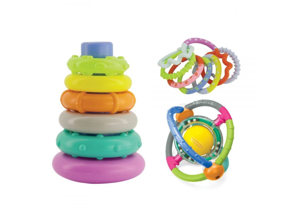 Sada hraček pro nejmenší je ideální jako první dárek pro miminko. Chrastítko Orbit s různými texturami ke zkoumání má tvar pro snadné uchopení rukou i ústy. Korálky uvnitř průhledného kroužku při pohybu jemně chrastí. Lehké a snadno uchopitelné chrastítko s kroužky je tvořené z osmi navzájem propojitelných kroužků, které můžete různými způsoby spojovat i používat samostatně. Každý kroužek nabízí jinou texturu ke zkoumání rukama i ústy. Pyramida je tvořena kulatou základnou a nasazovacími kroužky různých barev, velikostí i textur. Dítě se snaží umístit kroužky ve správném pořadí a vytvořit z nich pyramidu. Díky kulaté základně se hračka kýve do všech stran a nasazení kroužků bude pro dítě docela výzva! Hračky rozvíjí zábavným způsobem jemnou motoriku a koordinaci rukou a očí dítěte. Vhodné pro děti od narození.