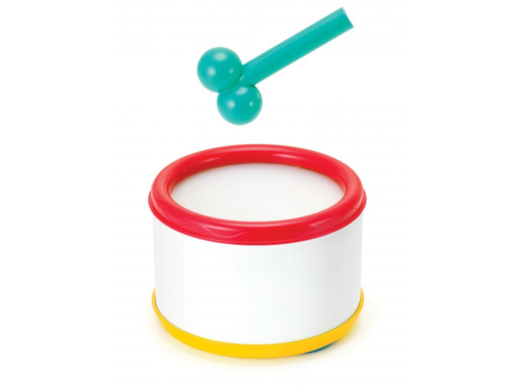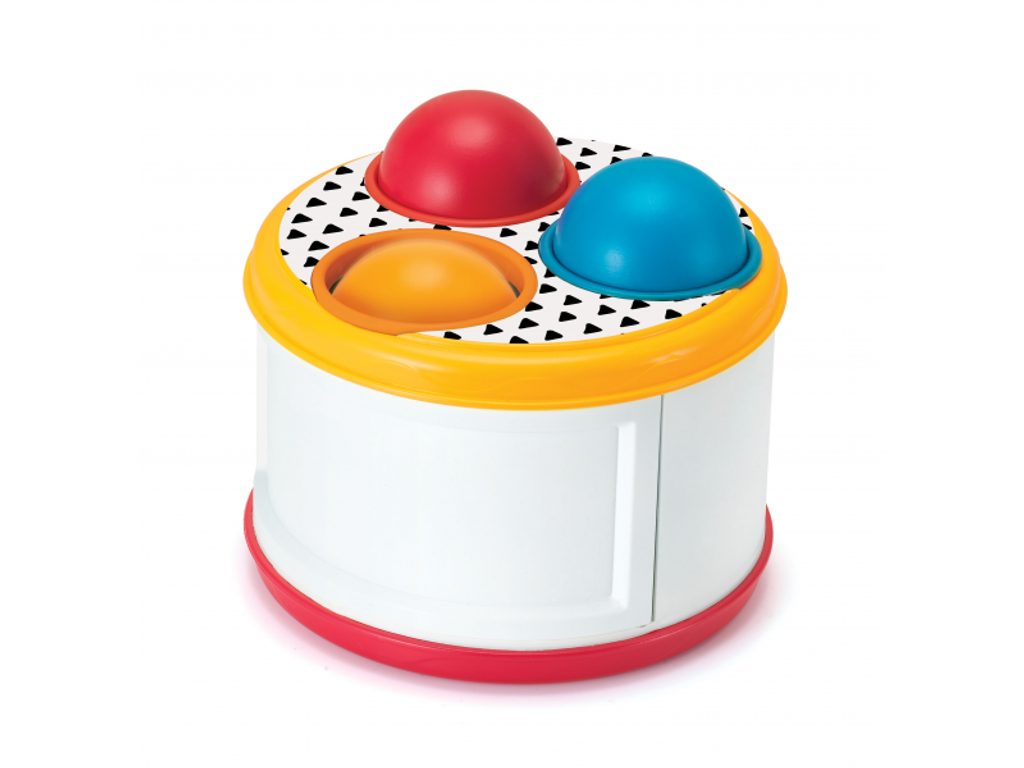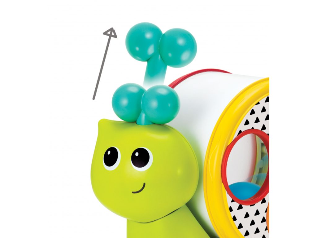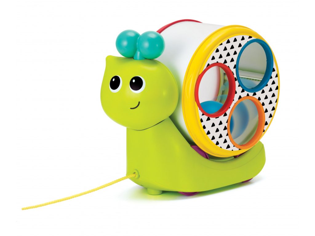 Tahací šnek na kolečkách má odnímatelnou ulitu ve tvaru bubínku, naplněnou třemi míčky. Součástí je i palička na bubínek. Hračka podporuje rozvoj smyslů a motoriky dítěte. Vhodné od 12 měsíců.