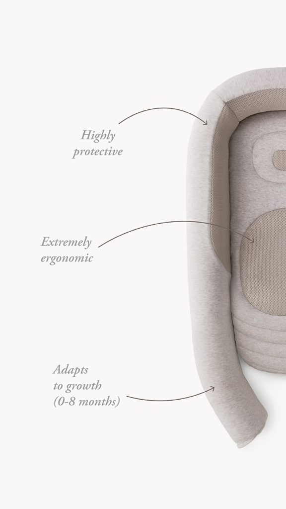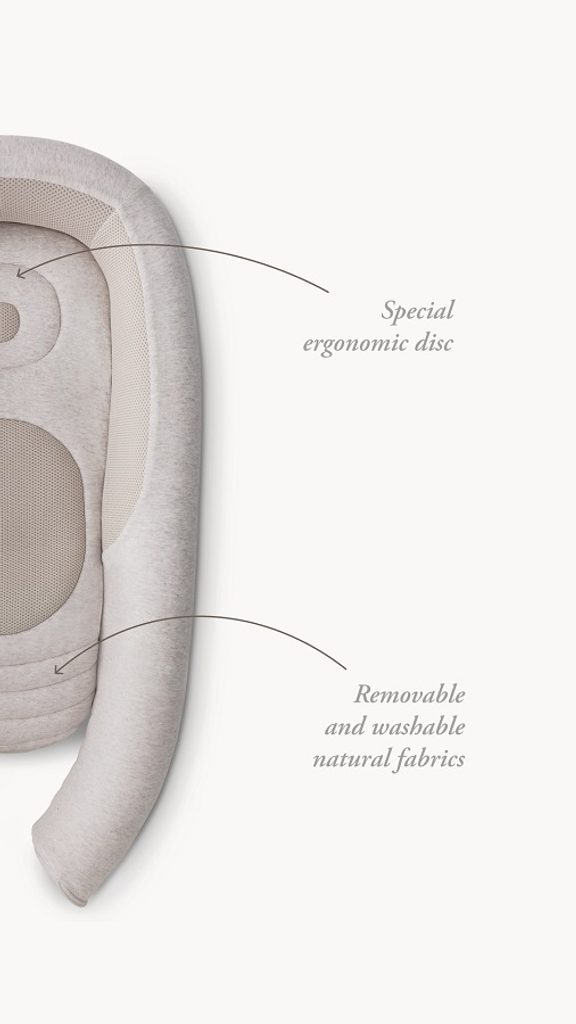 Pohodlí, prodyšnost a perfektní ergonomie: Tvar výrobku usnadňuje udržení polohy na břiše, zatímco tuhá opora na zádech vždy zaručí správnou posturu novorozence. Pevná podpěra je vybavena mikrootvory, které zvyšují prodyšnost, matrace obsahuje nastavitelný válec, který zaručuje přirozenou flexi nohou a v poloze hlavy je oválná podpora, která snižuje riziko plagiocefalie. Je to tím, že napomáhá správnému uzavření zadní fontanely. Použití prodyšných materiálů a přírodních tkanin, jako je bambus a bavlna, zaručují optimální pohodlí a prodyšnost a podporují přirozenou termoregulaci dítěte