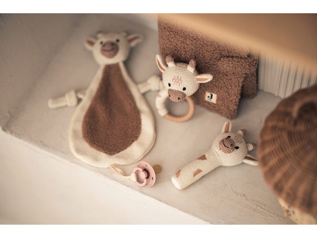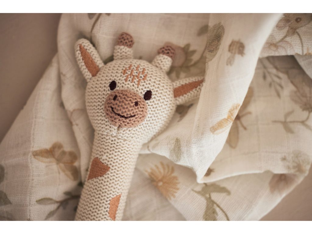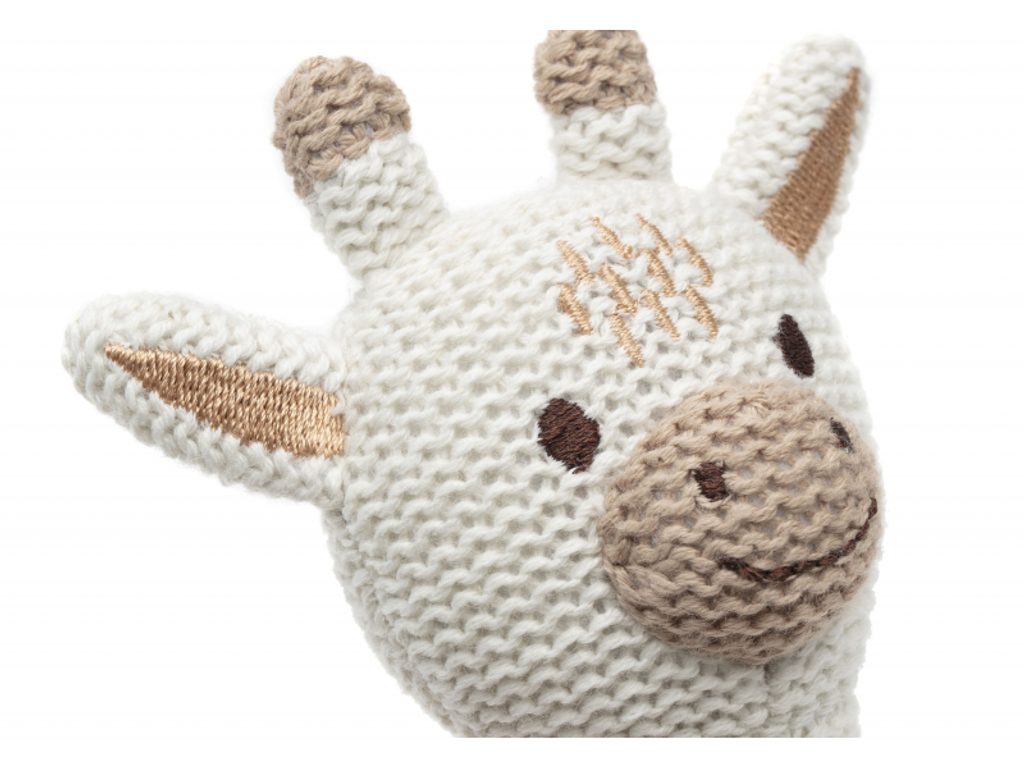 Chrastítko v podobě žirafy z měkkého bavlněného materiálu má tvar pro snadné uchopení a při pohybu jemně chrastí.