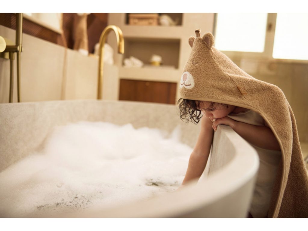 Měkká froté osuška s kapucí je perfektní pro rychlé a pohodlné osušení miminka po koupání.