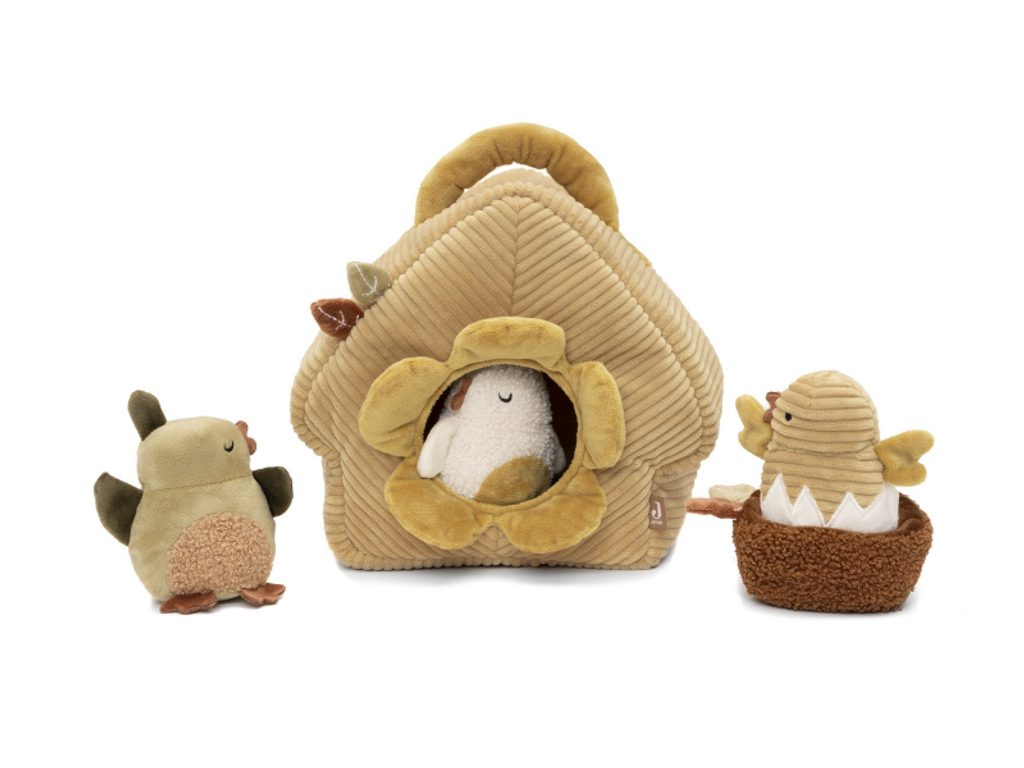 Veselá ptačí budka s třemi roztomilými ptáčky přinese vašemu dítěti nekonečné hodiny objevování a hraní. Schovávání ptáčků do budky i jejich vytahování ven pomáhá rozvíjet dětskou zvídavost, fantazii i jemnou motoriku. Budka je vybavena i držadlem pro snadné přenášení a při zmáčknutí šustí pro větší zábavu i stimulaci sluchu. Jemné barvy, příjemný materiál a kvalitní zpracování dělají z hračky i krásný doplněk dětského pokoje. Složení: 100 % polyester Rozměry: 26 × 18 × 24 cm Možno prát v ruce. Vhodné pro děti od narození.