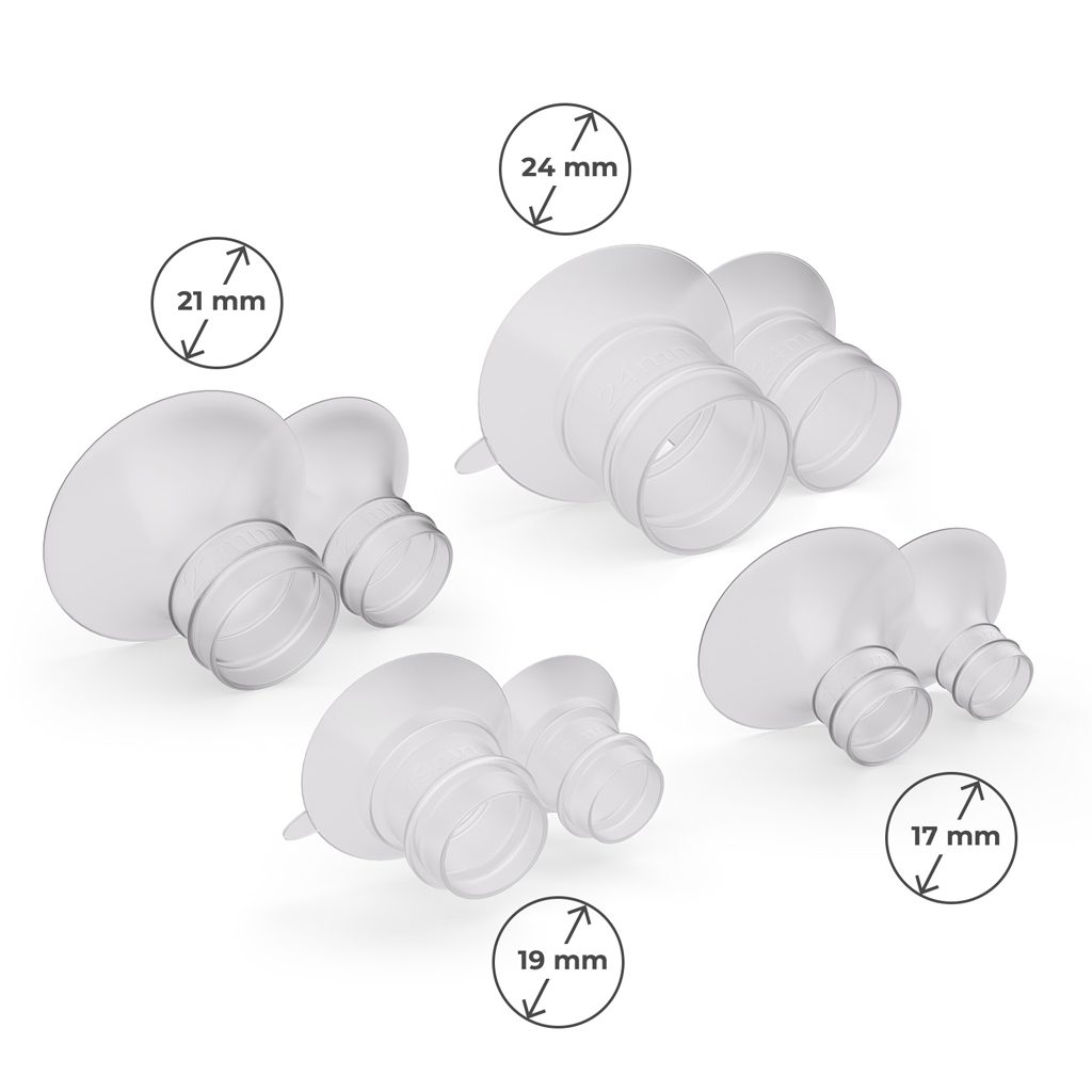 Sada obsahuje 5 velikostí trychtýřů (17, 19, 21, 24, 27 mm), které zajišťují dokonalé přizpůsobení anatomii prsu. Správné padnutí zlepšuje utěsnění a pohodlí, což zvyšuje kvalitu a účinnost odsávání.