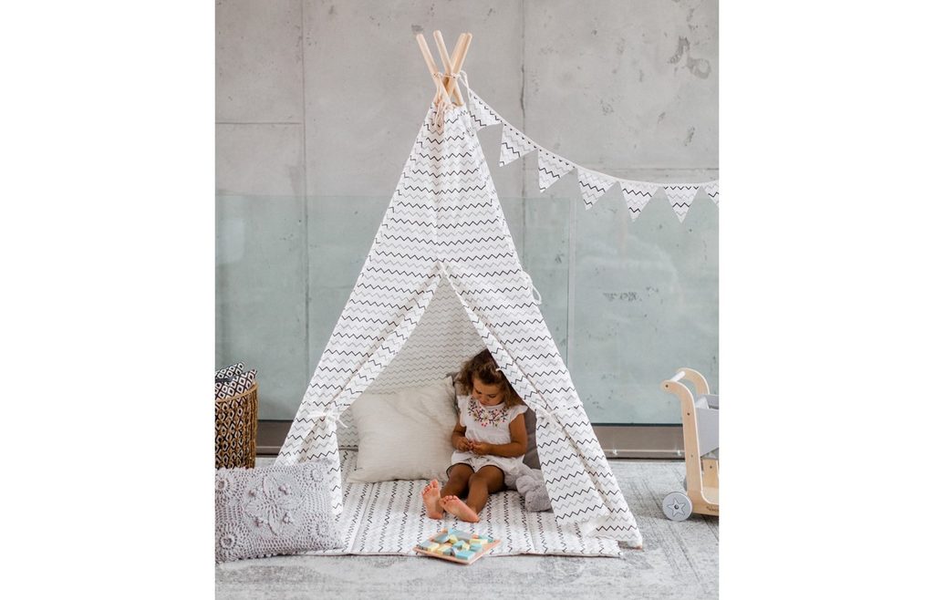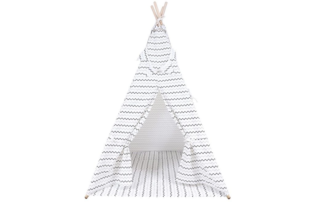 Indiánské teepee útulné místo pro chvíle odpočinku, zábavná skrýš dřevěná konstrukce bavlněná tkanina s okénkem na jedné straně podložka girlanda použité materiály jsou šetrné k životnímu prostředí a bez obsahu škodlivých látek rozměry: 112 x 107 x 160 cm materiál konstrukce: dřevo materiál textilie: 100% bavlna