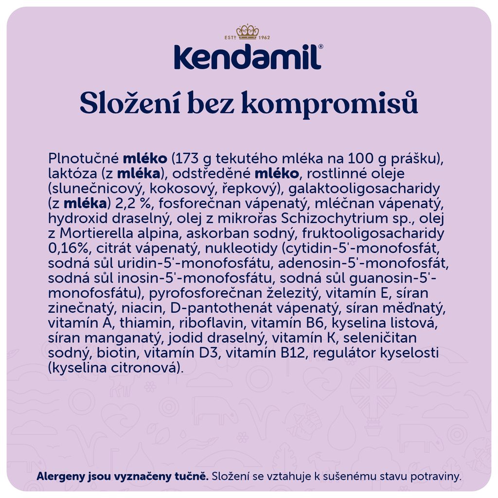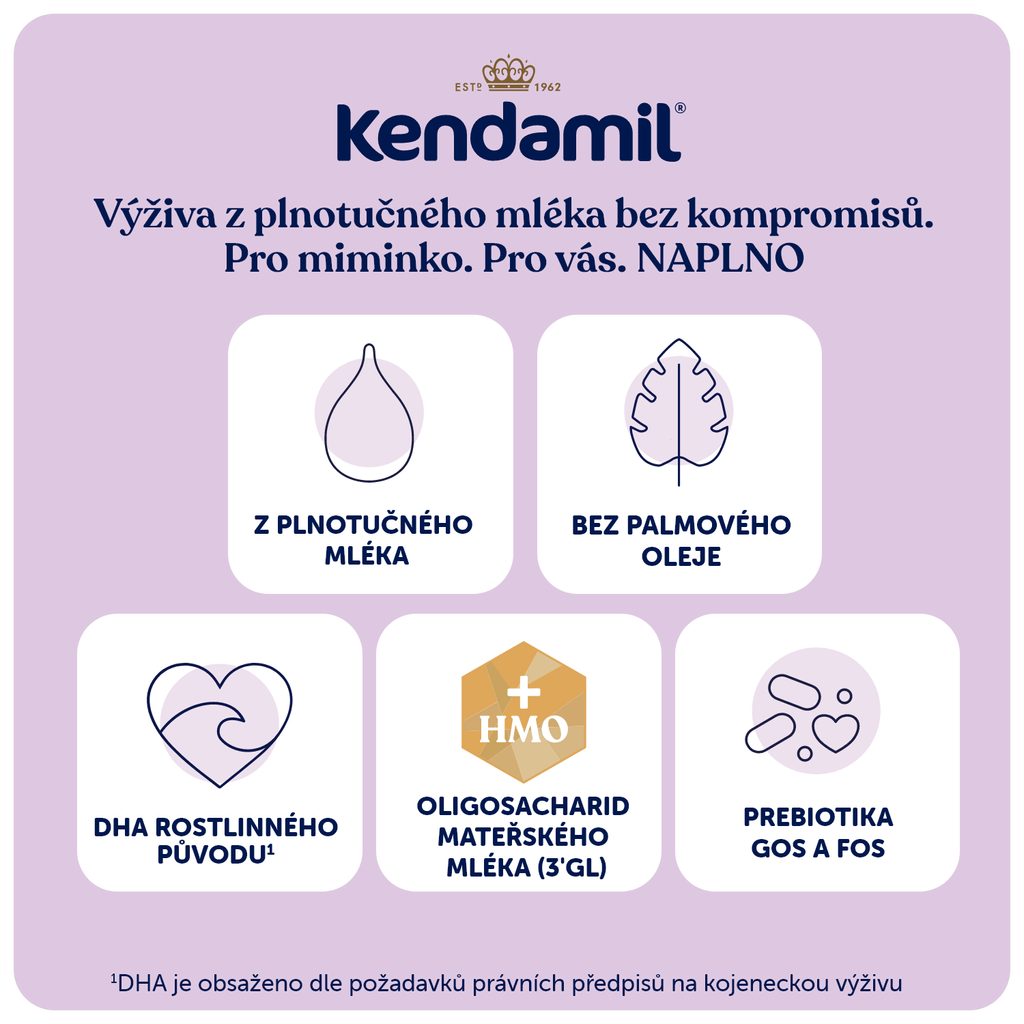 Mléka Kendamil Premium obsahují kyselinu dokosahexaenovou (DHA) rostlinného původu, kterou Kendamil získal z mořských řas. Jsou obohacena o kombinaci prebiotik (GOS a FOS) a oligosacharidů mateřského mléka HMO (3’GL). Speciální postup zpracování zajišťuje příjemnou mléčnou chuť. Obal mlék je plně recyklovatelný.