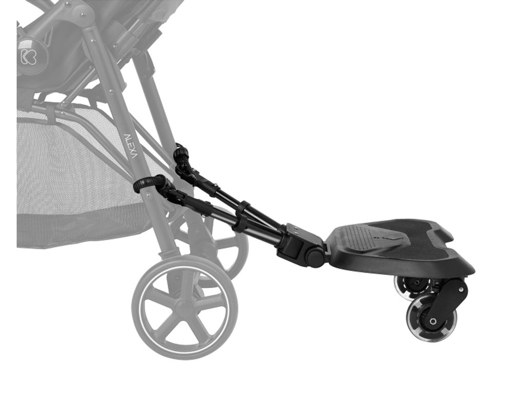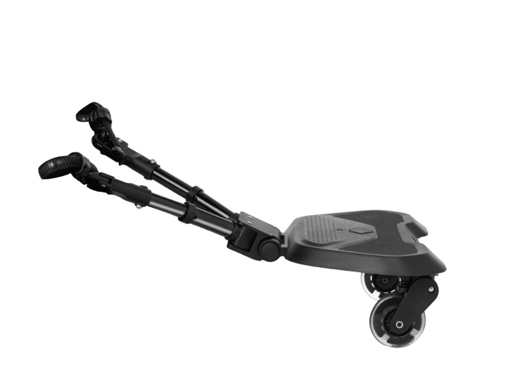 Instalace stupátka je velmi snadná díky přiloženým adaptérům. Otočná kola o 360° s odpružením a funkcí snadného uvolnění zajišťují plynulou jízdu. Nastavitelné adaptéry nabízejí tři různé možnosti délky a až osm různých výškových nastavení pro dokonalé přizpůsobení. Bezpečnost je zajištěna díky protiskluzové ploše, která zabraňuje sklouznutí dítěte. Když není stupátko používáno, je možné jej zajistit přídavným popruhem k rukojeti kočárku.