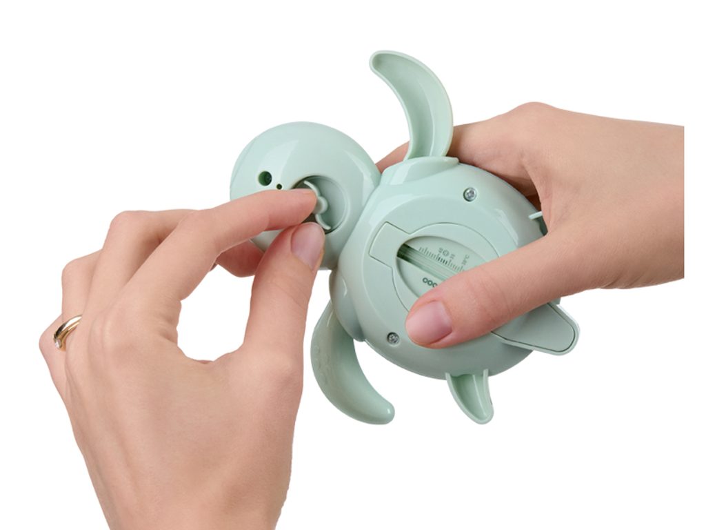 Tento teploměr ve tvaru roztomilé želvičky je skvělým pomocníkem pro měření teploty vody v dětské koupeli a zároveň originální hračkou, která zpestří každodenní koupání. Po natažení želvička pohybuje nohama a plave po hladině. Teploměr měří teplotu vody v rozmezí od 12°C do 54°C. Je vyroben z bezpečných materiálů, neobsahuje BPA ani rtuť.