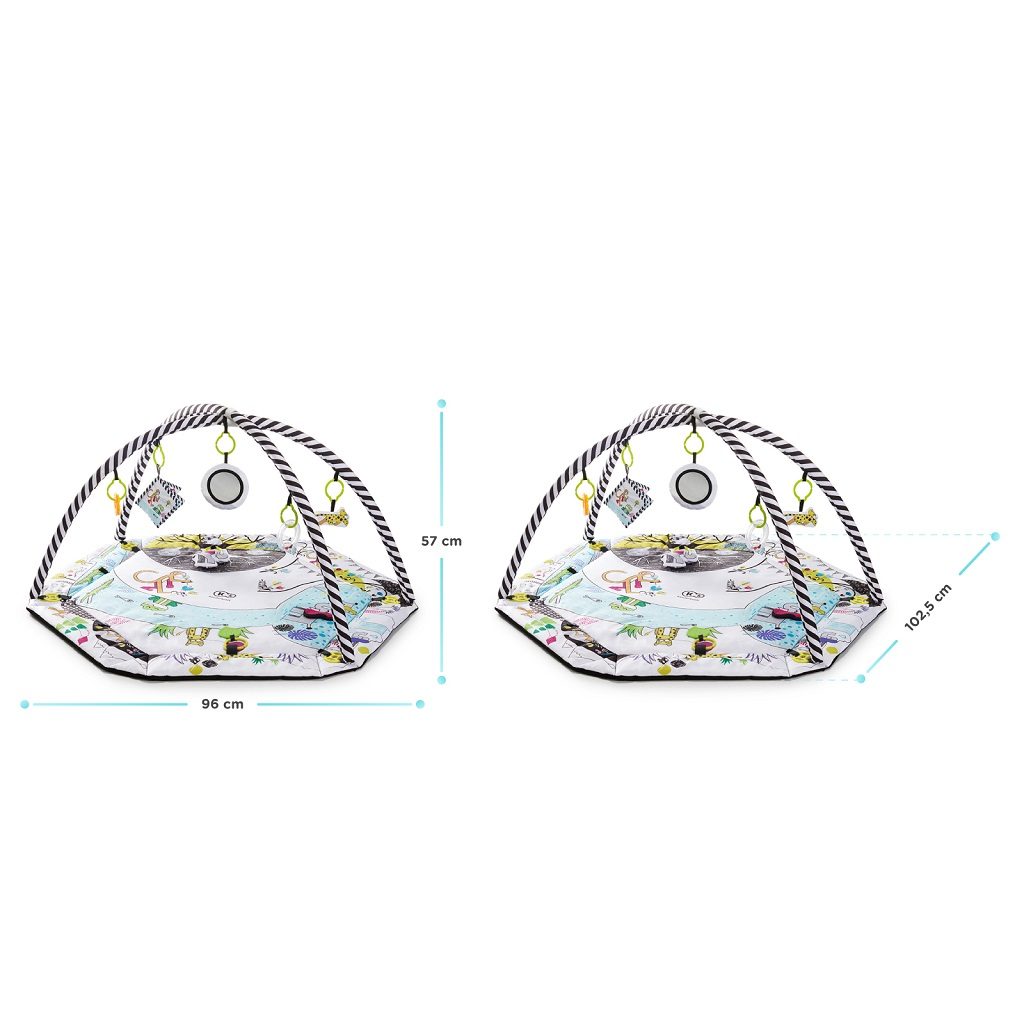 Hrací deka pro děti od narození. V sadě 7 hraček s různými estetickými a kognitivními vlastnostmi: zrcadlo, šustící kniha, 2 kousátka, pískací tygr chrastítko a zvonicí slon. Vlastnosti: - hračku na dece lze připínat v závislosti na věku dítěte a jeho preferencích - pohodlný polštářek - hrazda s hračkami s univerzálním konektorem, takže jejich pozicí lze přizpůsobit samo - unikátní design – černo-bílé detaily povzbuzující smysly dítěte od prvních dnů - 20 míčků ve 4 barvách – možnost použití jako bazénku s míčky - kvalitní polstrovaní zlepšuje komfort používaní - 6 barevných boků s různými motivy – boky lze spojit a stvořit bezpečnou ohrádku. - stimuluje hmat - stimuluje sluchu - stimuluje zraku - rozvíjí motorické a manuální dovednosti - snadné skládaní a přepravovaní - je vyroben z vysoce kvalitních, bezpečných materiálů Výrobek byl testován a schválen v souladu s evropskými bezpečnostními normami EN 71-1 Technické parametry: Materiál: 100% polyester. Návod zde: