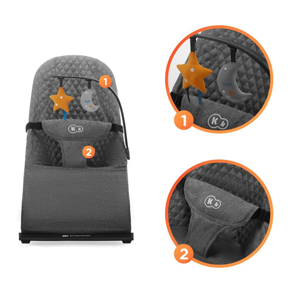 Lehátko MIMI přináší čistý minimalismus, uzavřený v překrásné formě. Je to bezpečí, pohodlí a elegance v jednom. Pomůže zklidnit Vaše dítě i během velmi neklidných dnů a zároveň jej nebude příliš stimulovat. A když si bude chtít hrát – bude mít k dispozici 2 závěsné hračky. Žádná světýlka ani hlasité zvuky. Díky třístupňovému nastavení opěradla lehátko snadno přizpůsobíte potřebám dítěte. Ideálně uzpůsobená sedačka z příjemné látky rovnoměrně rozkládá váhu dítěte a podporuje přirozenou polohu během odpočinku.