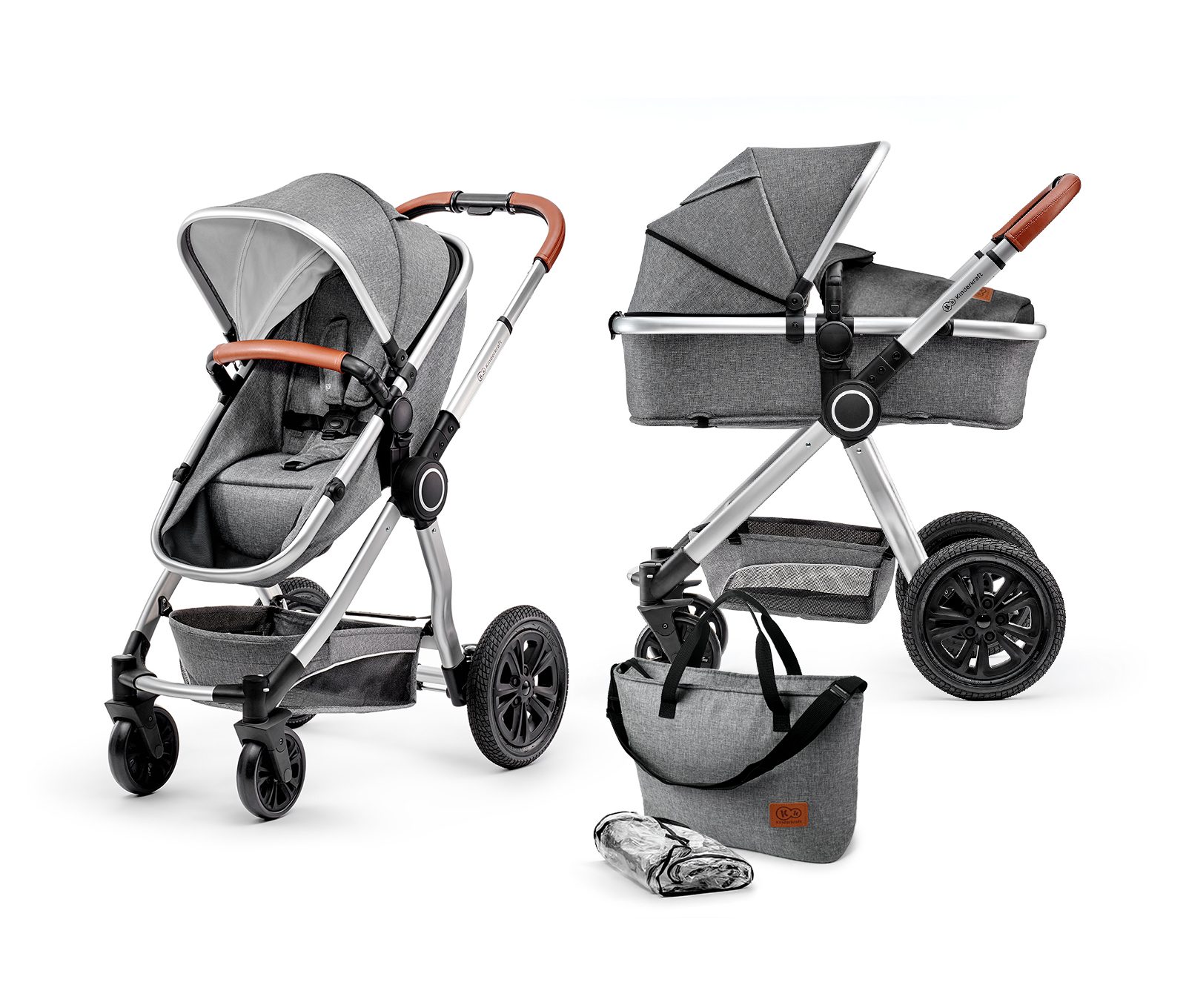 Kombinovaný kočárek VEO s příslušenstvím. Funkce: - hluboký a sportovní kočárek v jednom - dvě úrovně funkce tlumení nárazů - hliníková a odolná konstrukce - snadné a rychlé skládání - včetně adaptérů pro autosedačky Hluboký a sportovní kočárek v jednom VEO jsou dvě funkce v jednom kočárku - hluboký od prvních dnů života (až do 9 kg), který se s několika pohyby změní na sportovní kočárek pro starší děti (od 6 měsíců do 15 kg). Pohodlné a úsporné! Dvě úrovně systému tlumení nárazů Efektivní systém tlumení otřesů v obtížném terénu s možností nastavení během chůze. S velkými nastavitelnými pružinami na zadní nápravě můžete zvýšit úroveň tlumení nárazů a poskytnout dětem pohodlí pouze jedním pohybem. Snadná manipulace Lehký hliníkový rám a ovladatelnost nejsou všechno. Teleskopickou rukojeť lze nastavit podle výšky dítěte. Pro větší pohodlí je potažena jemnou a elegantní povrchovou úpravou z umělé kůže. Jednoduché skládání Skládání a rozkládání je jednoduché - kočárek můžete během několika sekund rozložit. Pojistka chrání před náhodným sklopením. Bezpečnost především - 5bodový bezpečnostní pás s polstrováním. - odnímatelné madlo - potažené umělou kůží. - dvojitá ochrana před náhodným složením/rozložením. - centrální brzda na zadní nápravě kočárku. - vyrobeno v souladu s evropskou normou EN 1888, která definuje bezpečnostní požadavky a zkušební metody pro kočárky. Hluboký kočárek - velká hluboká korba s měkkou matrací pro nejmenší děti. - 3bodové nastavení opěrky hlavy v korbičce. - dodatečný kryt chrání dítě před větrem, deštěm a chladem. - ochrana před vnějšími vlivy může být rozšířena pomocí zipu. - stříška s průhledným oknem, které se bezdotykově otevírá a zavírá pomocí magnetu. Sportovní kočárek - sedačku lze namontovat ve směru nebo v protisměru jízdy. - 5bodový snadno nastavitelný bezpečnostní pás s polstrováním a výškovým nastavením. - prostorné opěradlo kočárku lze nastavit ve třech polohách a nastavitelná opěrka nohy poskytuje téměř vodorovnou polohu ideální pro zdřímnutí. - ochrana před vnějšími vlivy může být rozšířena pomocí zipu. - přístřešek s průhledným oknem, které se bezdotykově otevírá a zavírá pomocí magnetu. Kola - velmi velká zadní kola (průměr 31 cm) - z tlusté pryže. - zadní náprava má centrální brzdu. - otočná přední kola mohou být zablokována v poloze pro pohyb dopředu, vyrobené z EVA pěny. Rám - skládací systém zajišťující malou velikost po sklopení. - hliníkový rám poskytuje lehkou, ale pevnou konstrukci. - teleskopická rukojeť s pozvolným nastavením výšky od 98,5 cm do 106,5 cm. - snadné a jednoduché skládání a rozkládání kočárku. Adaptéry Adaptéry připojené ke kočárku VEO jsou kompatibilní s autosedačkami: Kinderkraft MINK; Cybex: Aton, Aton 2, Aton 4, Aton Q; Maxi Cosi: Mico, Mico AP, Mico NXT, Mico Max 30, Citi, Cabrio, CabrioFix, Pebble, Pebble Plus; BeSafe: iZi Go, iZi Go Modular; Kiddy: Evo-Lunafix i Evolution Pro 2 oraz Cloud Q: Nuna Pipa, Petite&Mars GL Cub Příslušenství - pláštěnka - fusak - adaptéry pro autosedačky - nákupní košík - taška přizpůsobená potřebám rodičů: velká, prostorná s další vnitřní kapsou. Otevřený zipem pro snadný přístup. Specifikace - značka: Kinderkraft - model: VEO - rám: hliník - materiál: polyester, ekologická kůže - rozměry a hmotnost výrobku při rozložení: Délka: 92 cm, šířka 60 cm, výška: 98,5-106,5 cm / 12 kg - rozměry a hmotnost krabice: 76 x 50 x 31 (cm) / 14,4 kg Návod zde: