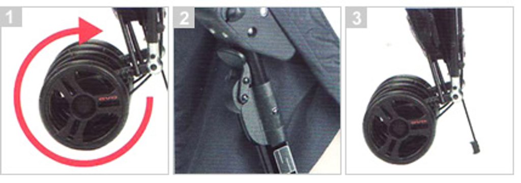 při skládání se zadní kolečka sklopí pomocí kulového kloubu "ball joint" směrem dovnitř a tím se kočárek ještě zmenší