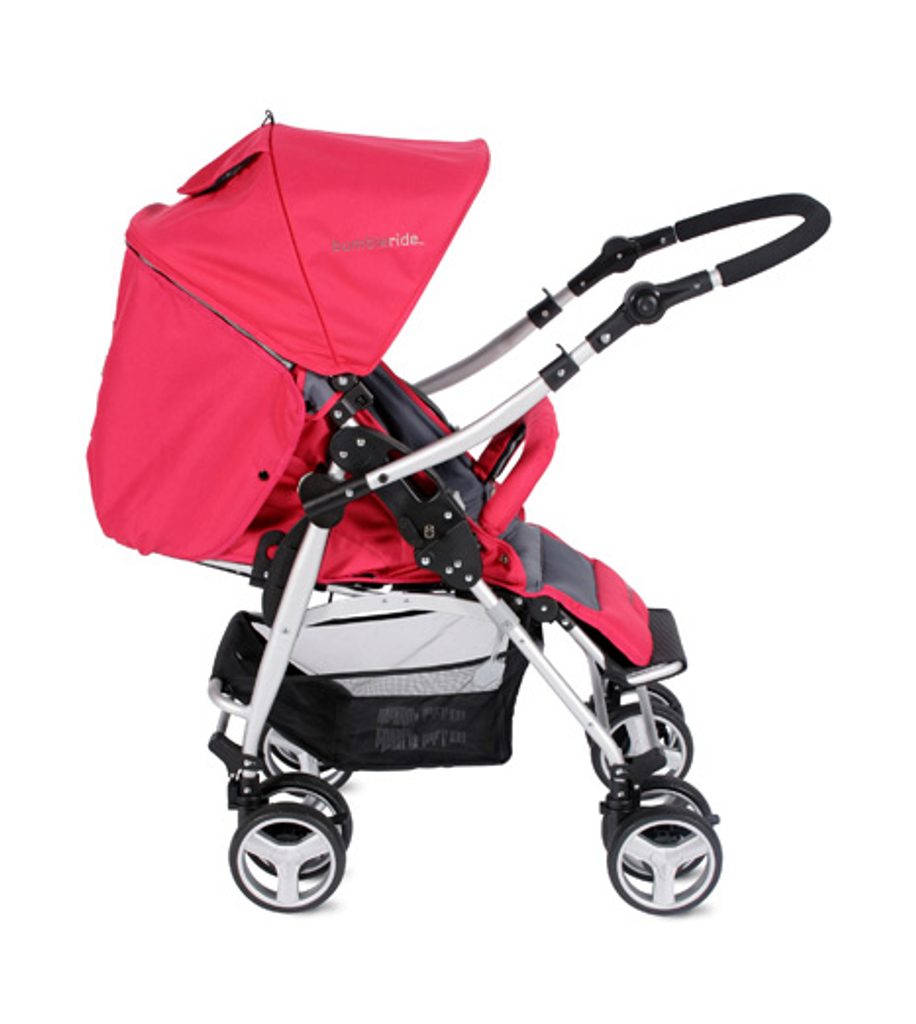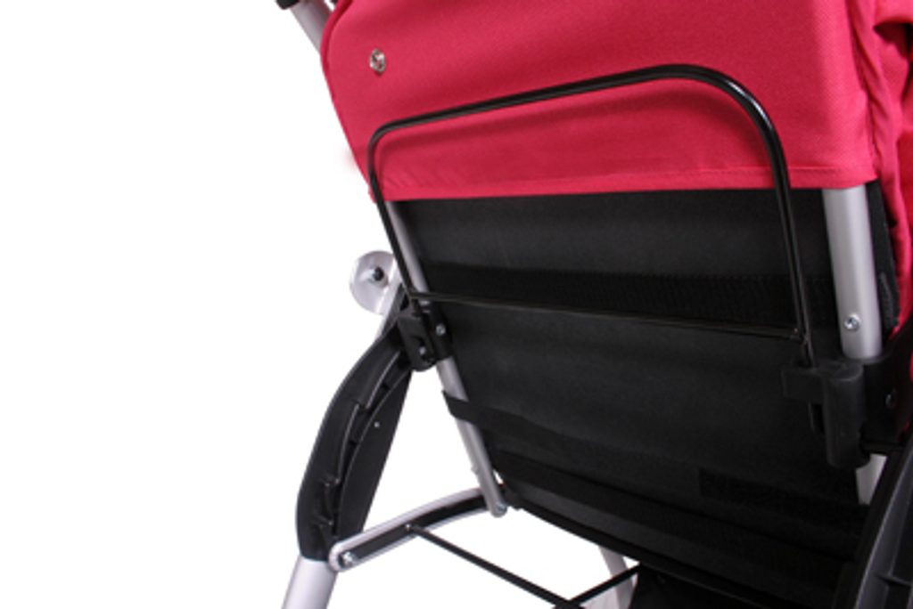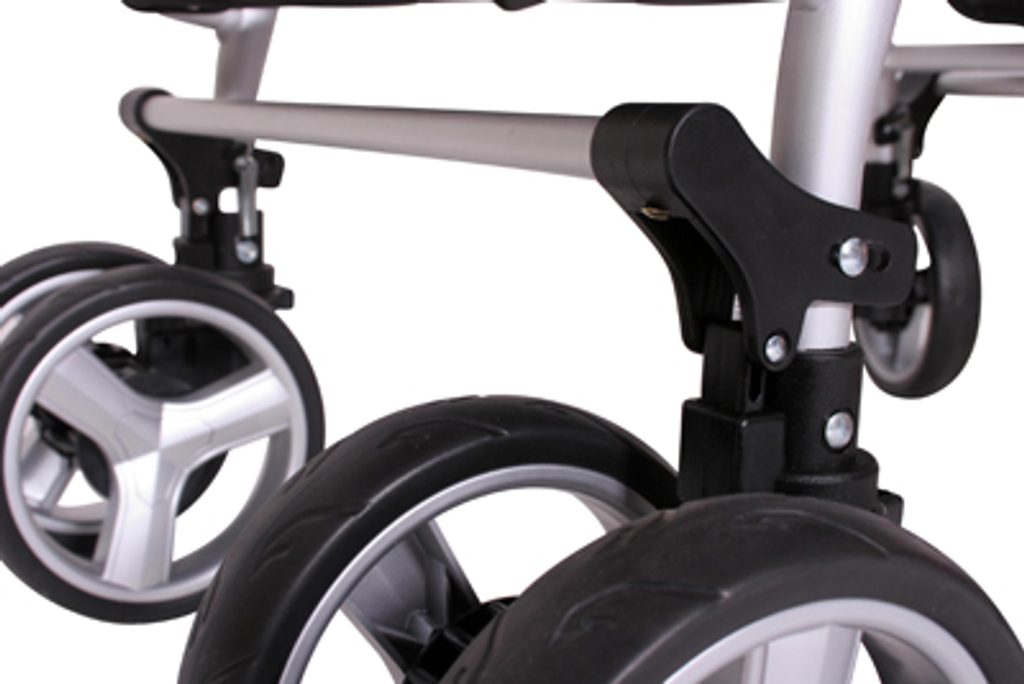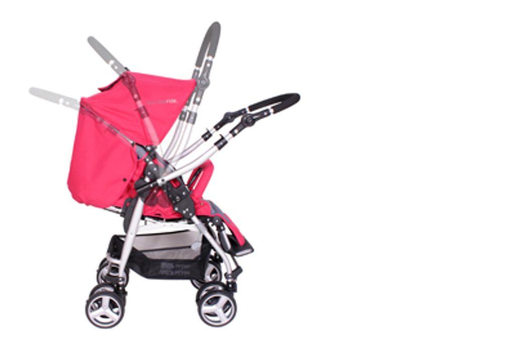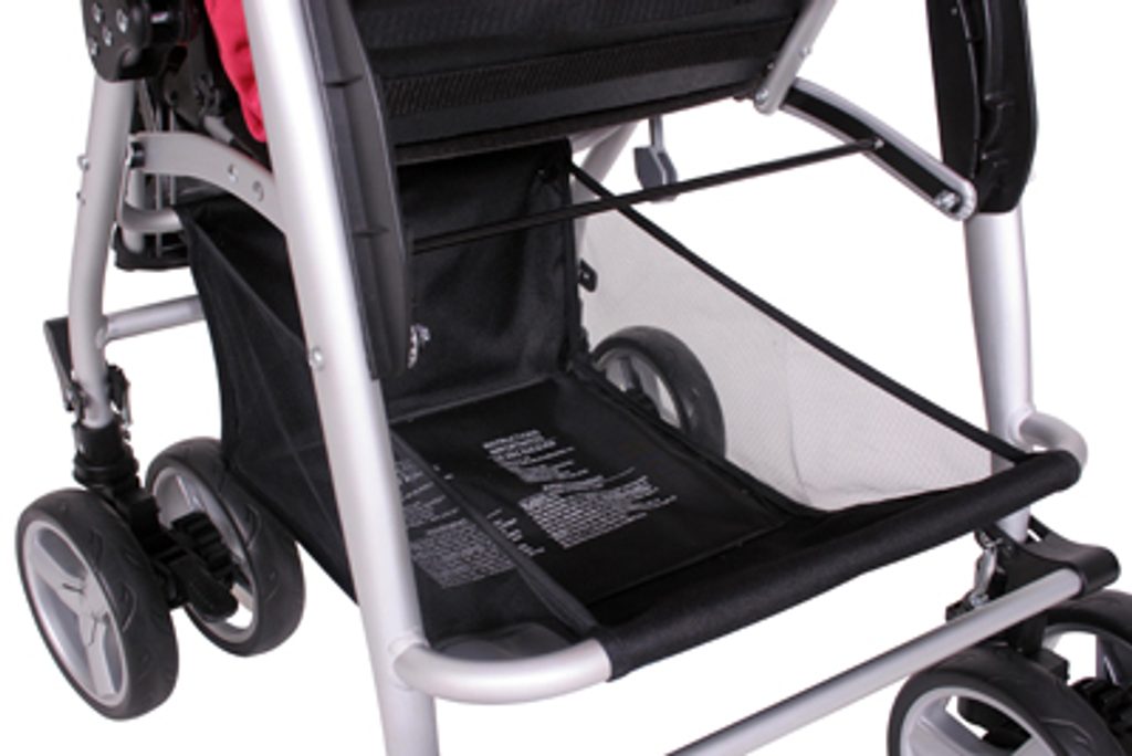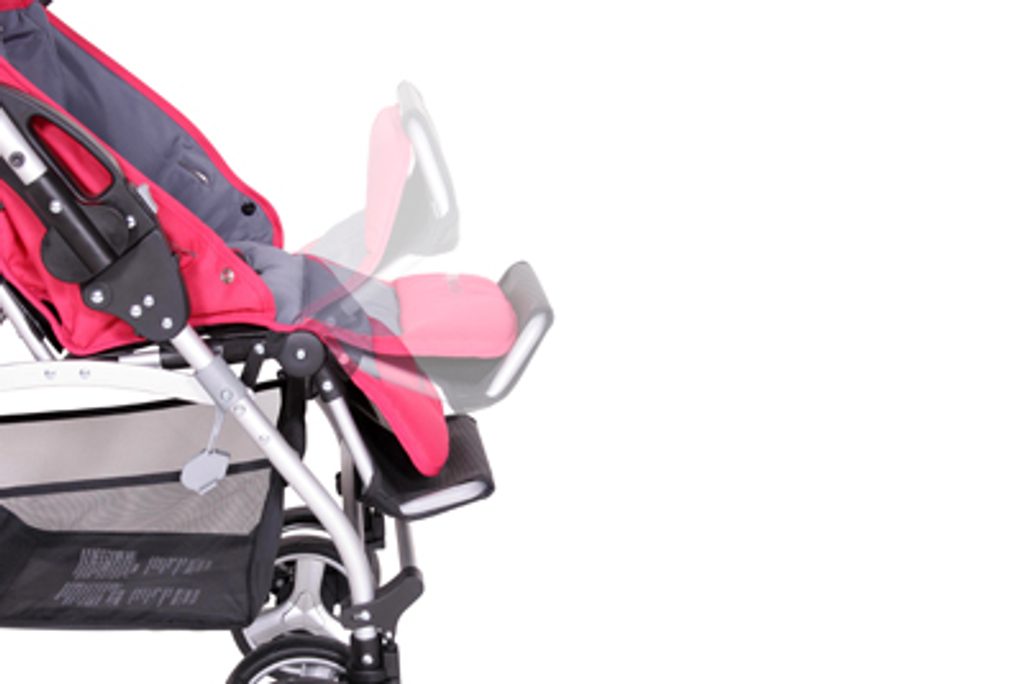 Kočárek má polohovací opěrku zad i nohou do úplného lehu, všechna kola jsou odpružená.