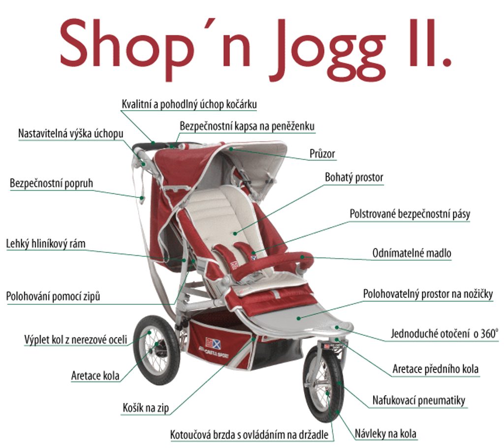 Přední kolo otočné o 360° (možnost fixace) s kotoučovou brzdou, která se ovládá na madle. Nedílnou součástí kočárku je Podložka do Shop´n Jogg II černá, která je fakturována zvlášť a je proto potřeba ji při koupi kočárku připočítat k ceně!