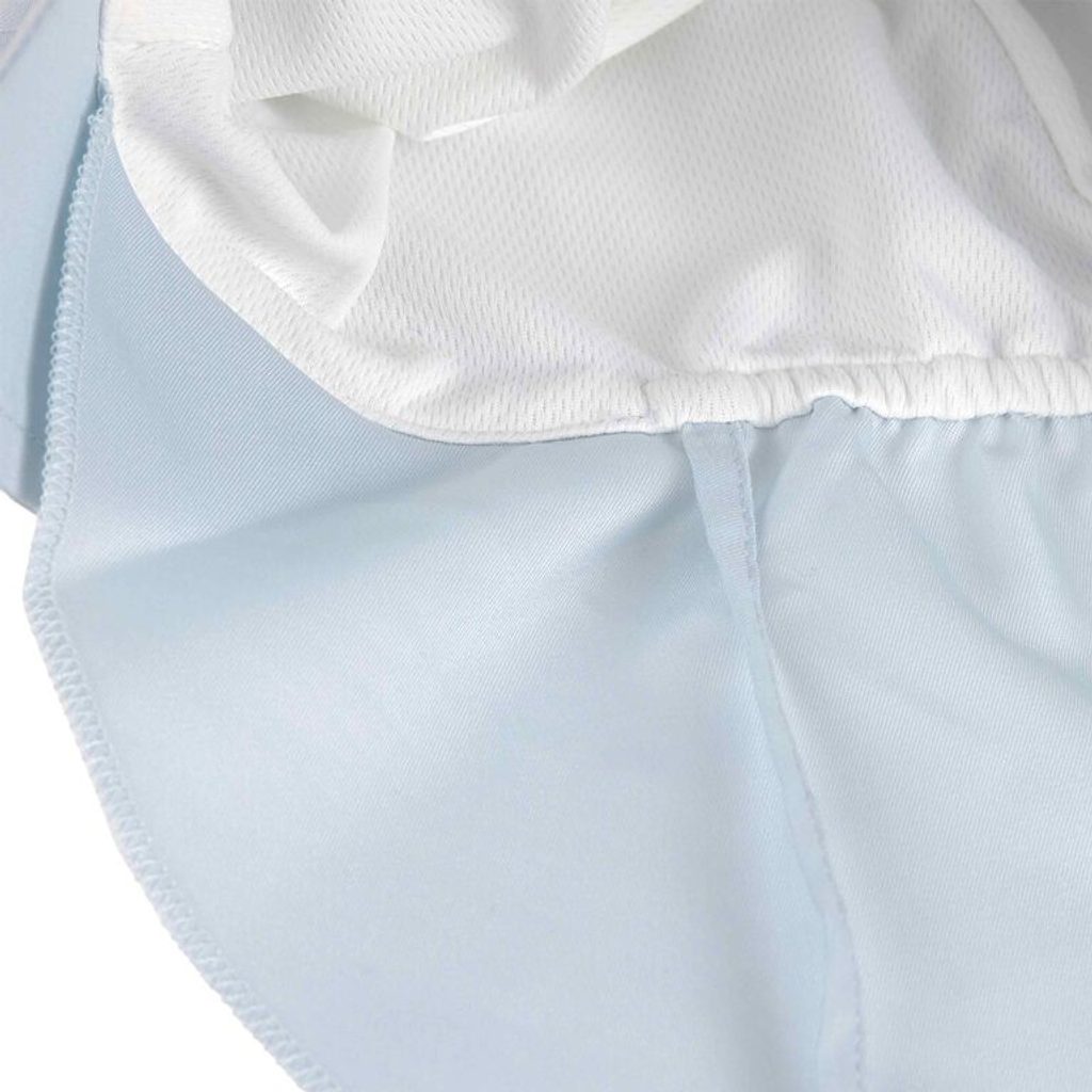 Klobouček má UPF 80, přední kšilt pro stínění obličeje a očí a extra dlouhou zadní část, která chrání krk a zátylek – přesně ta místa, která se u dětí nejčastěji spálí. Podšívka z funkčního materiálu odvádí vlhkost směrem ven, takže se dětská hlavička tolik nepotí a klobouček je příjemný i při delším nošení. Vnější látka je z 100% polyesterového mikrovlákna vyrobeného z recyklovaného materiálu.