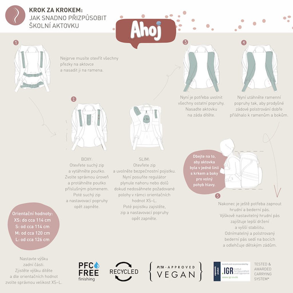 Srdcem celého setu je školní batoh s rovným pevným tvarem a ergonomickým nosným systémem, který se individuálně přizpůsobuje každému dítěti. Vhodný pro děti od 6 let do výšky 152 cm se čtyřmi stupni nastavení: