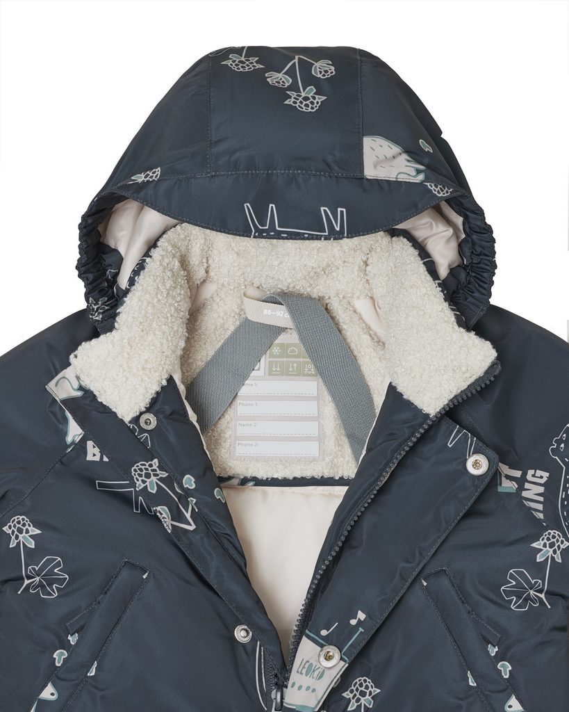 • materiál příslušenství: plastový zip s ocelovým běhounem, ocelové knoflíky s plastovými krytkami, silikonový štítek s logem Leokid, elastické polyesterové pásky, plastové knoflíky a silikonové proužky