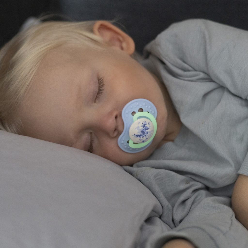 Dudlík má svítící úchyt, který vám umožní jej rychle najít ve tmě.