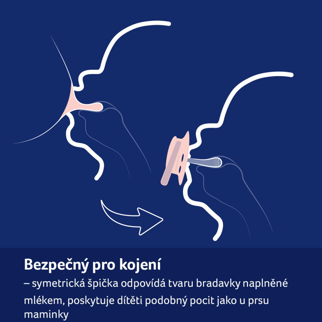 Symetrický tvar špičky podobný bradavce naplněné mlékem, miminku poskytuje podobný pocit jako u prsu maminky.