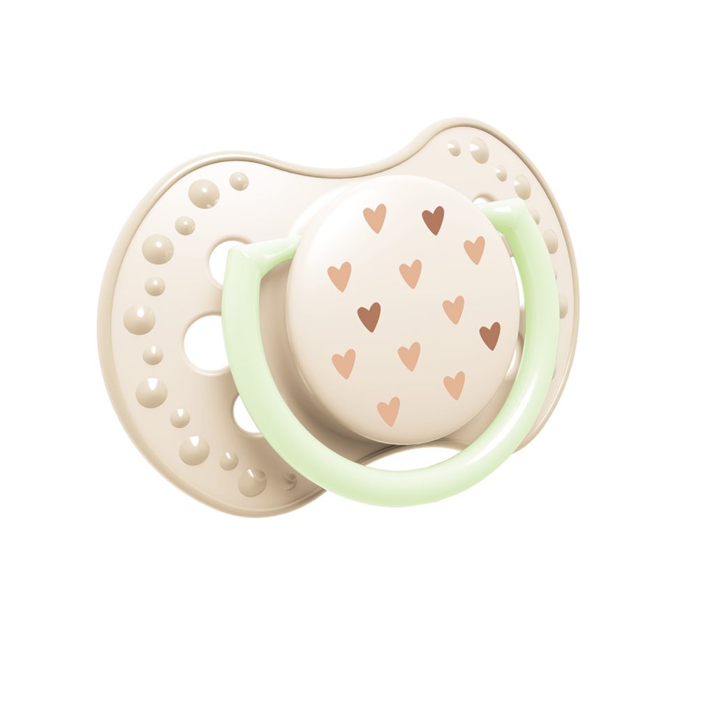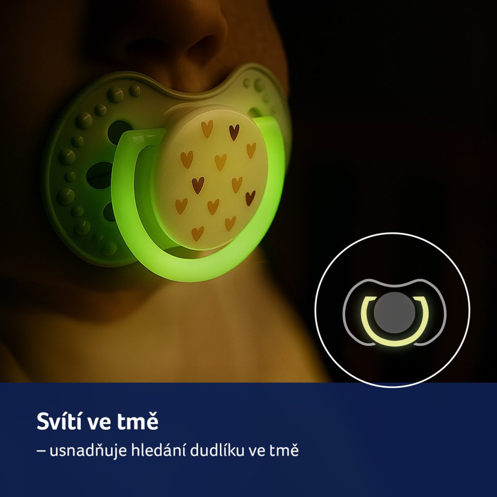 Dudlík má úchytku svítící ve tmě, což usnadňuje jeho hledání v noci.