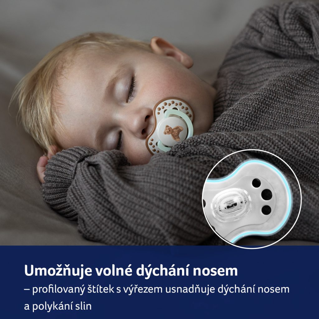 Profilovaný štítek s výřezem usnadňuje dýchání nosem a polykání slin, tak jak je tomu u prsou.