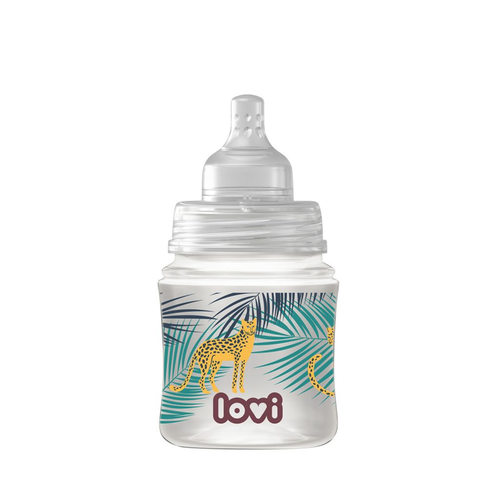Lahev o objemu 120 ml bezpečná při kojení v designu kolekce JUNGLE VIBES. Lahev LOVI Trends pro krmení dětí odstříkaným mlékem od matky. Bezpečné pro kojené dítě, nenarušuje sací reflex a nenarušuje přirozené krmení.