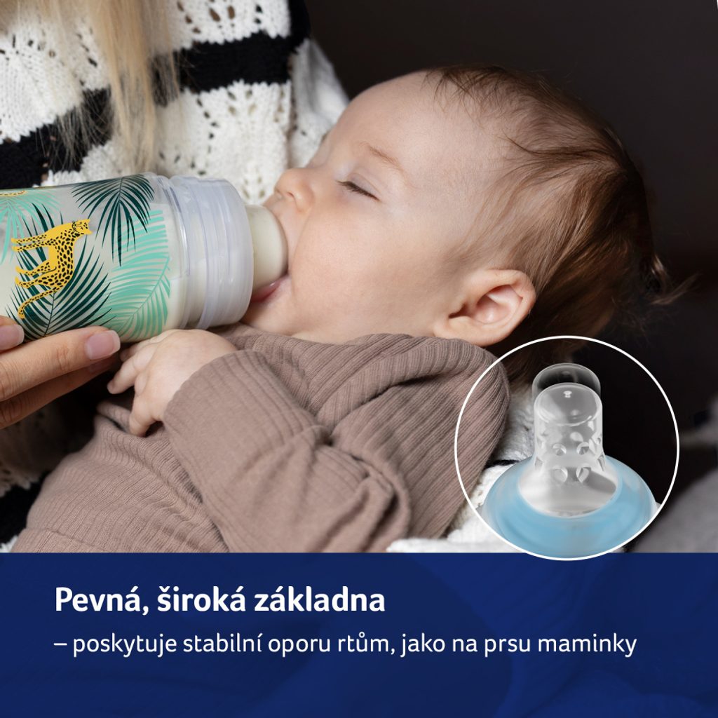Pevná základna ze silnějšího silikonu umožňuje stabilní oporu pro správné umístění rtů na savičce.
