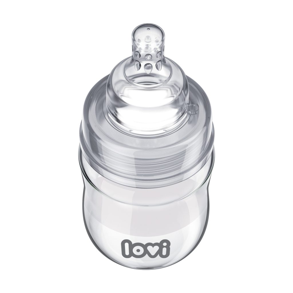 LOVI skleněná lahev s dynamickou savičkou je navržena tak, aby podporovala přirozené kojení a nenarušovala sací reflex miminka.