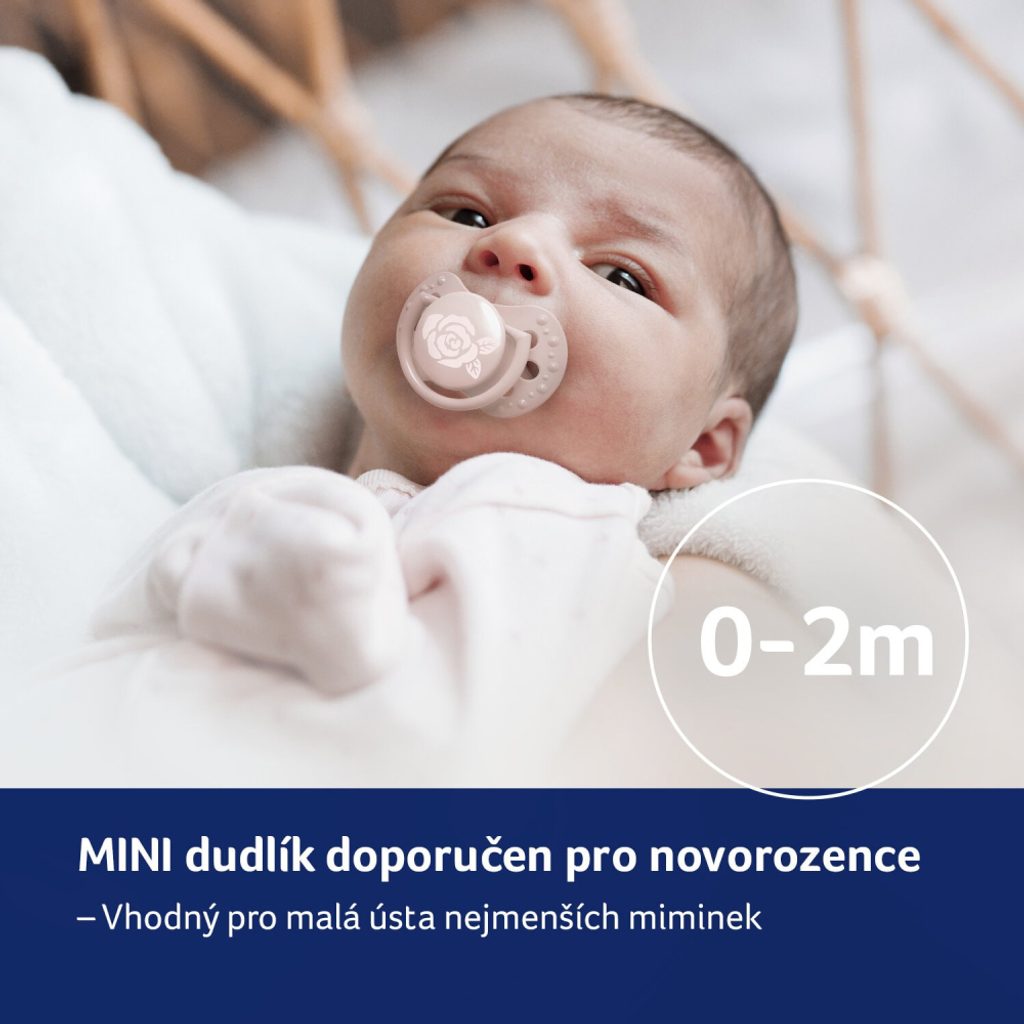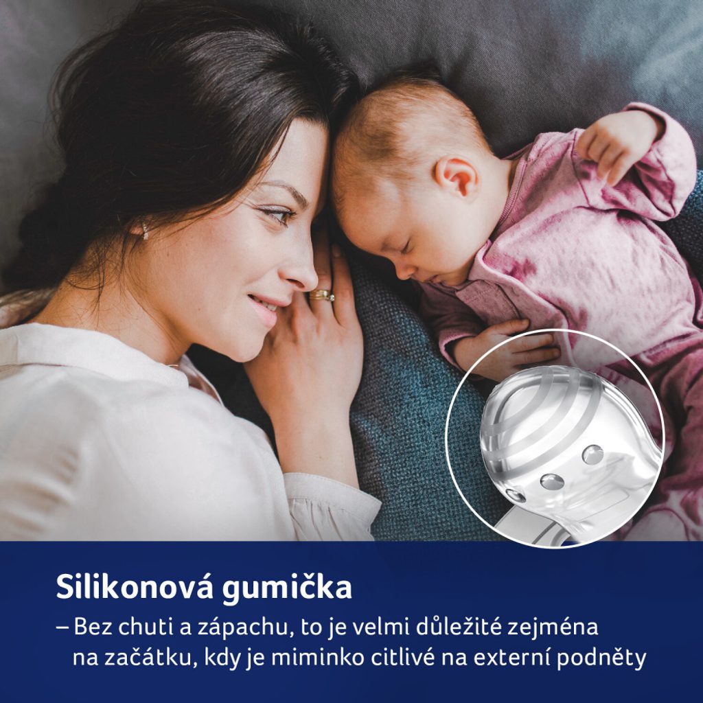 Přizpůsoben malé tváři novorozenců. Umožňuje dítěti volně dýchat nosem, vyrobeno z bezpečných materiálů, neobsahuje bisphenol A.