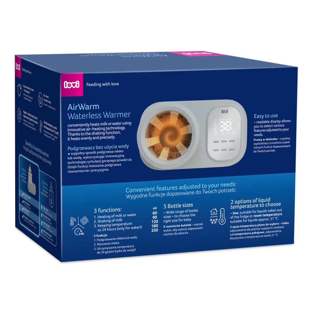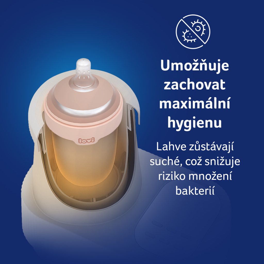 Objevte nový způsob ohřívání obsahu kojeneckých lahví s LOVI AirWarm. Díky technologii ohřevu horkým vzduchem není potřeba voda, takže je ohřívač snadno udržovatelný, bez vodního kamene a lahve zůstávají suché – snižuje se tak riziko množení bakterií.