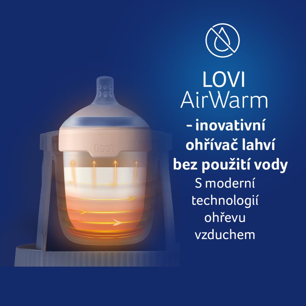 LOVI AirWarm: ohřívač lahví bez použití vody s inovativní horkovzdušnou technologií. Rovnoměrný ohřev, přesná teplota 37–48 °C, snadná údržba a teplá voda až 24 h.