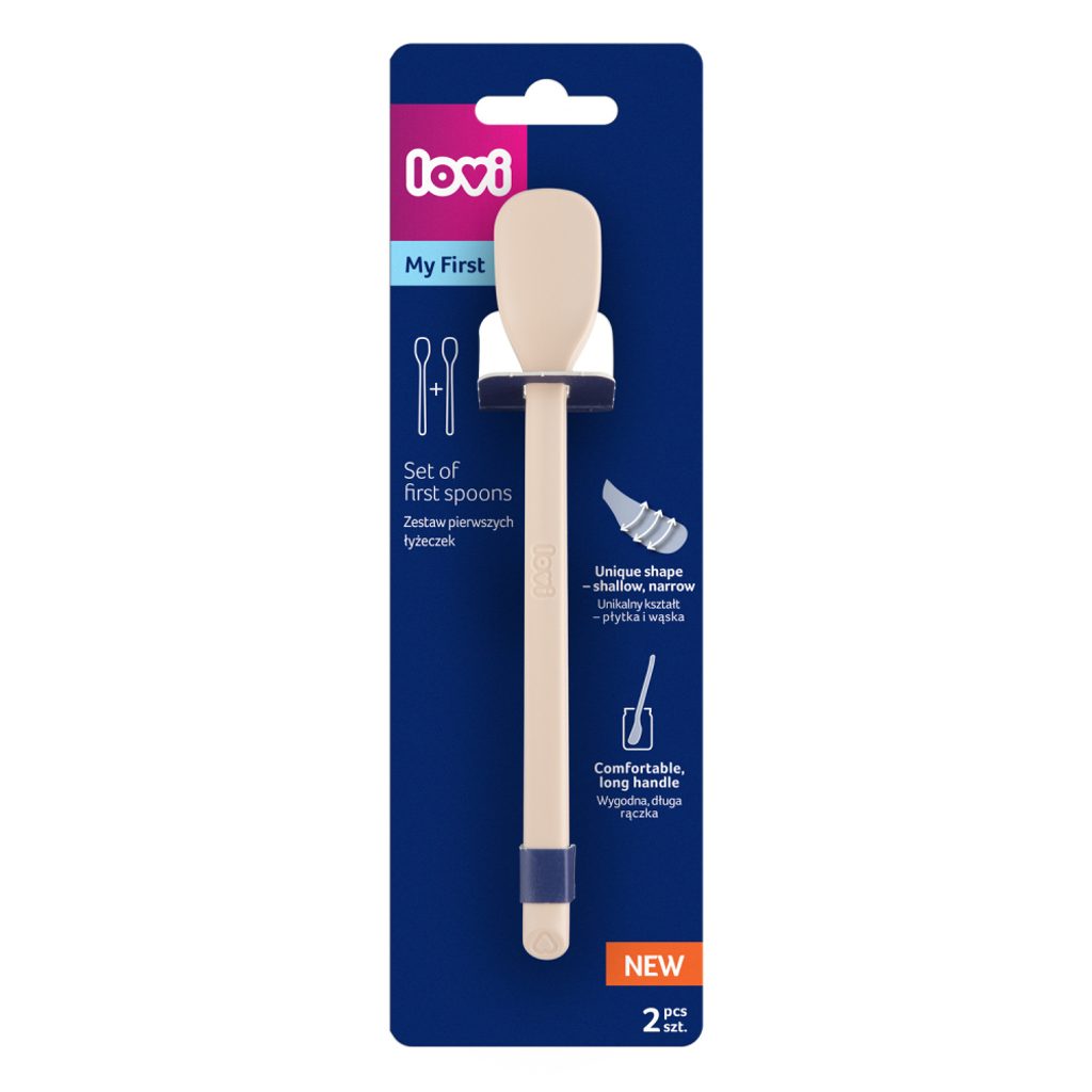 První krmící lžička je mělká, úzká a pevná, takže je ideální pro zahájení rozšiřování stravy. Pohodlná dlouhá rukojeť usnadňuje rodičům nabírání jídla  ze sklenice a krmení dítěte. Umožňuje dítěti snadno uchopit lžičku. Lžičky LOVI mají jedinečný tvar, podobný logopedické špachtli, aby dítěti usnadnily vytahování jídla.​