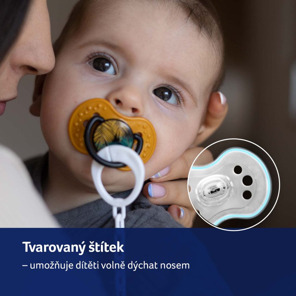 Jeho tvar umožňuje dítěti snadno dýchat nosem; jsou použity bezpečné materiálu bez bisfenolu A.