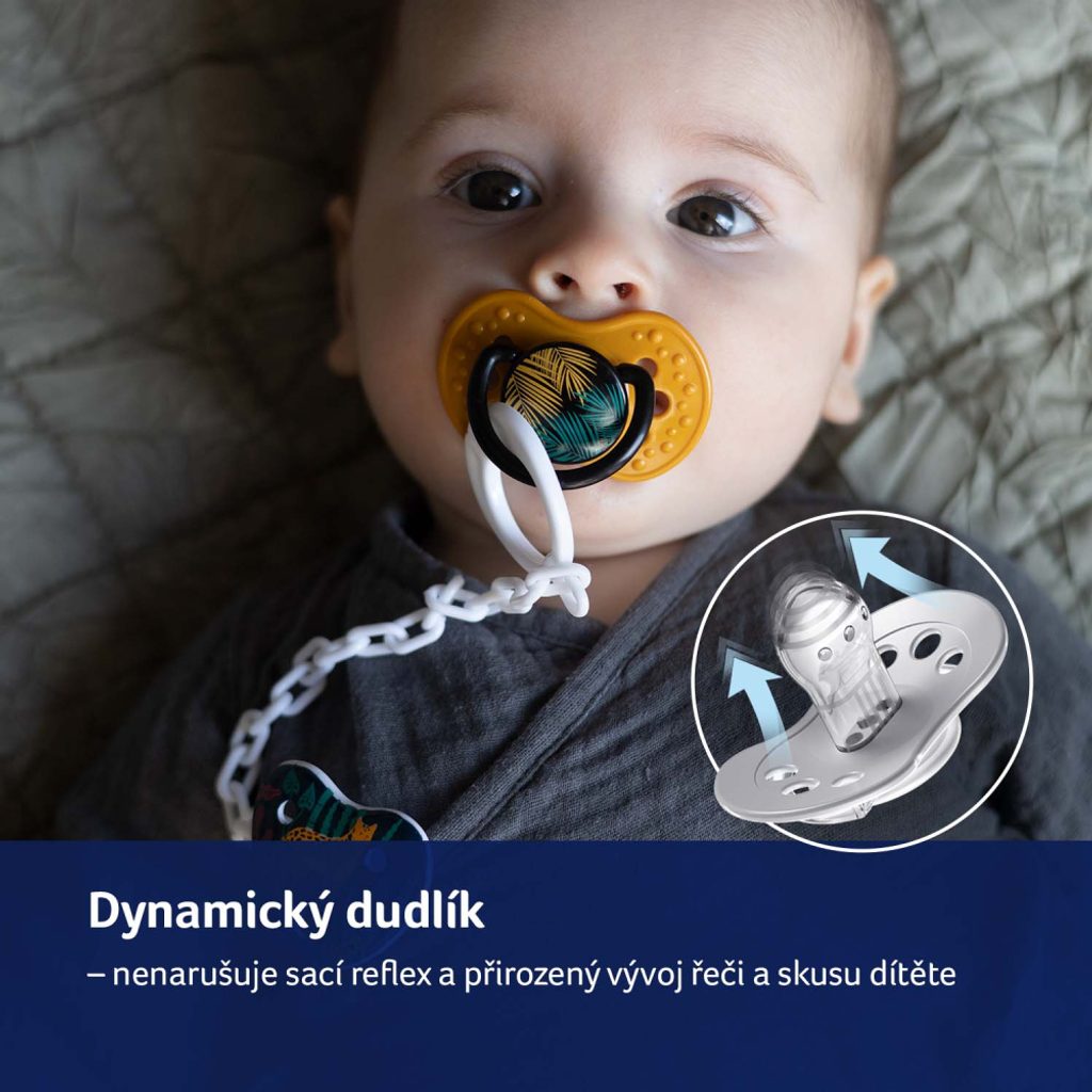 Silikonový dynamický dudlík LOVI® navržený s pomocí neurologopedů. Jedinečný design: heterogenní silikon a symetrický tvar inspirovaný bradavkou. Nenarušuje sací reflex a přirozený vývoj řeči a skusu dítěte. Neobvyklý design a barvy dudlíku podtrhují jedinečnost kolekce JUNGLE VIBES.