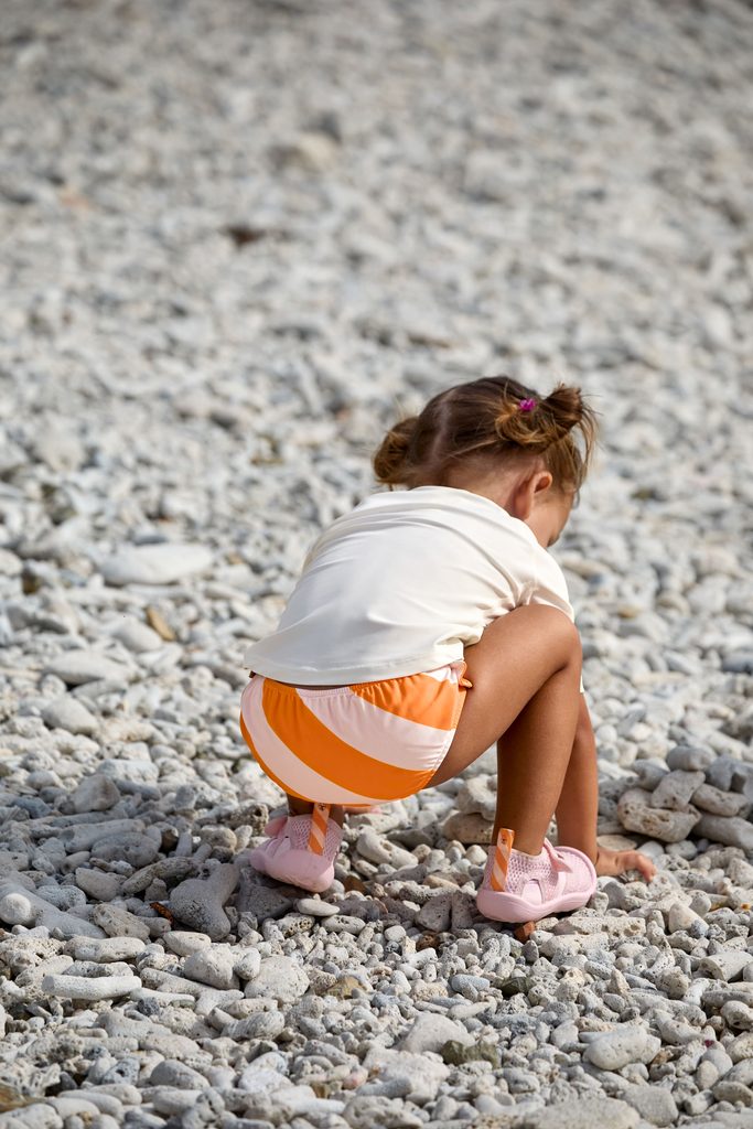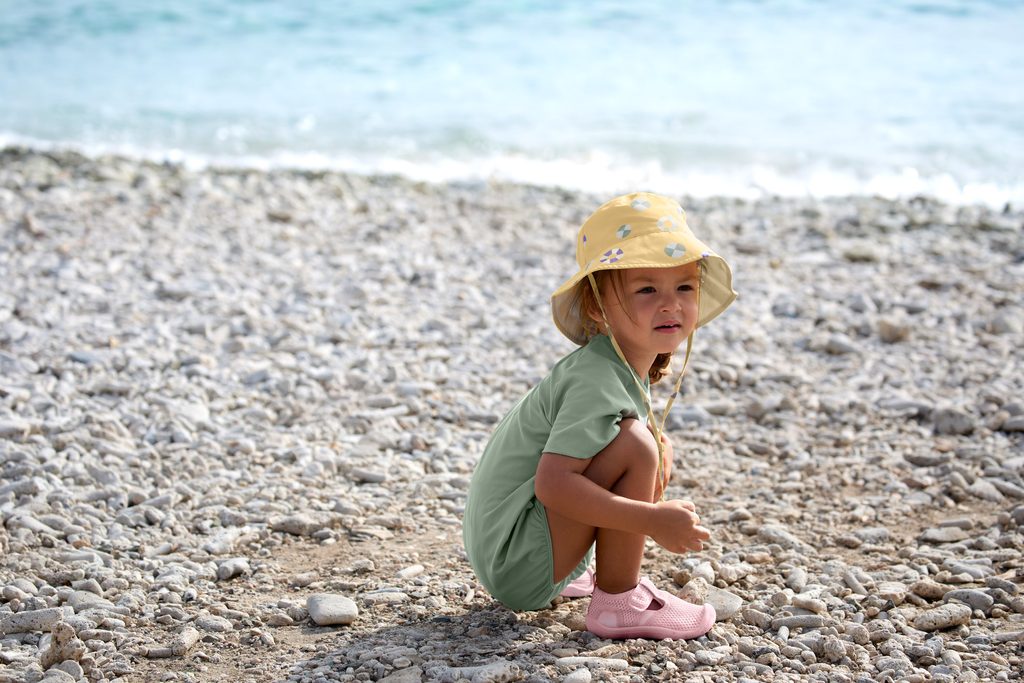 Prodyšný a rychleschnoucí materiál zajišťuje pohodlí i po celodenním šplouchání. Suchý zip umožňuje snadné nazouvání a zároveň drží sandálek pevně na místě – žádné posouvání, žádné odírání. Měkká ohebná podrážka s protiskluzovou úpravou dodává jistotu na každém povrchu, a velkorysá špička dává prostor pro zdravý vývoj nožičky. Po návratu z pláže stačí hodit do pračky.