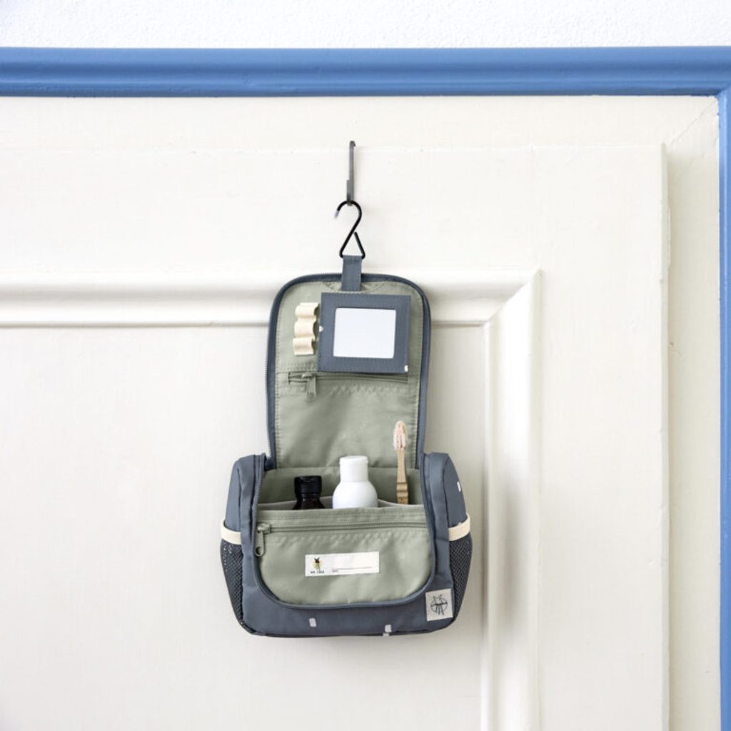 obrázek se zvířátkem na přední straně washbagu, který je možné přichytit pomocí patentky