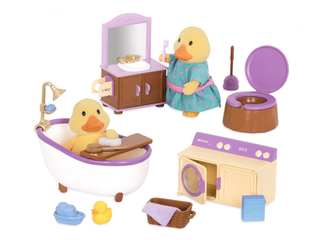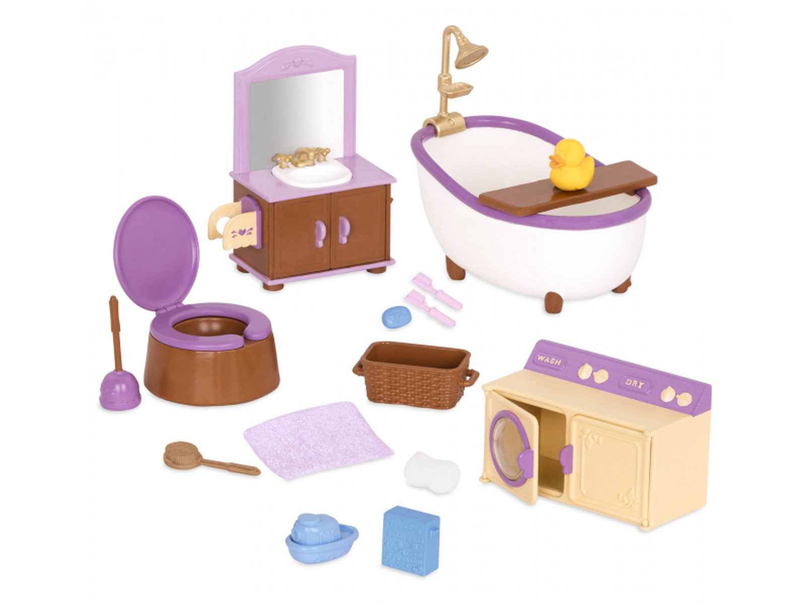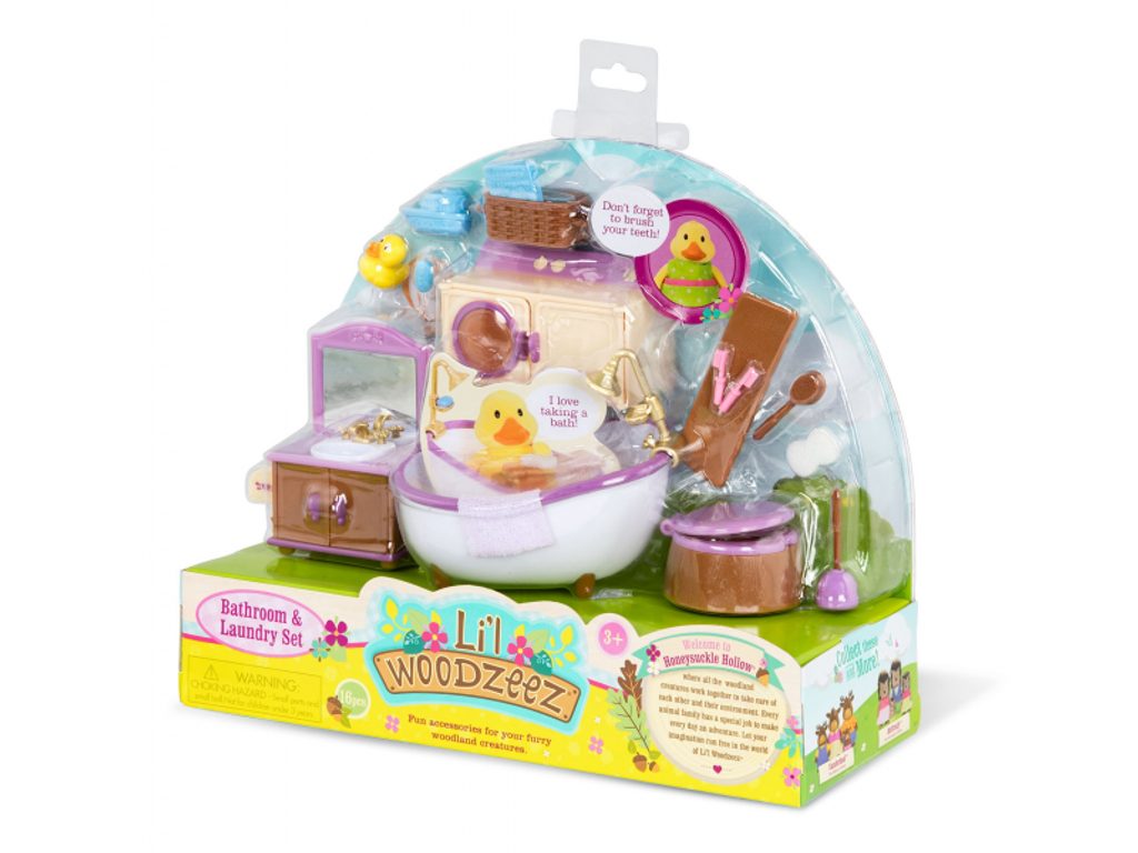 Sada nábytku vám umožní vybavit koupelnu v domečku pro postavičky zvířátek Li'l Woodzeez. Zvířátka si budou užívat voňavou koupel ve vaně a až bude potřeba vyprat, pračka i sušička jsou připravené!