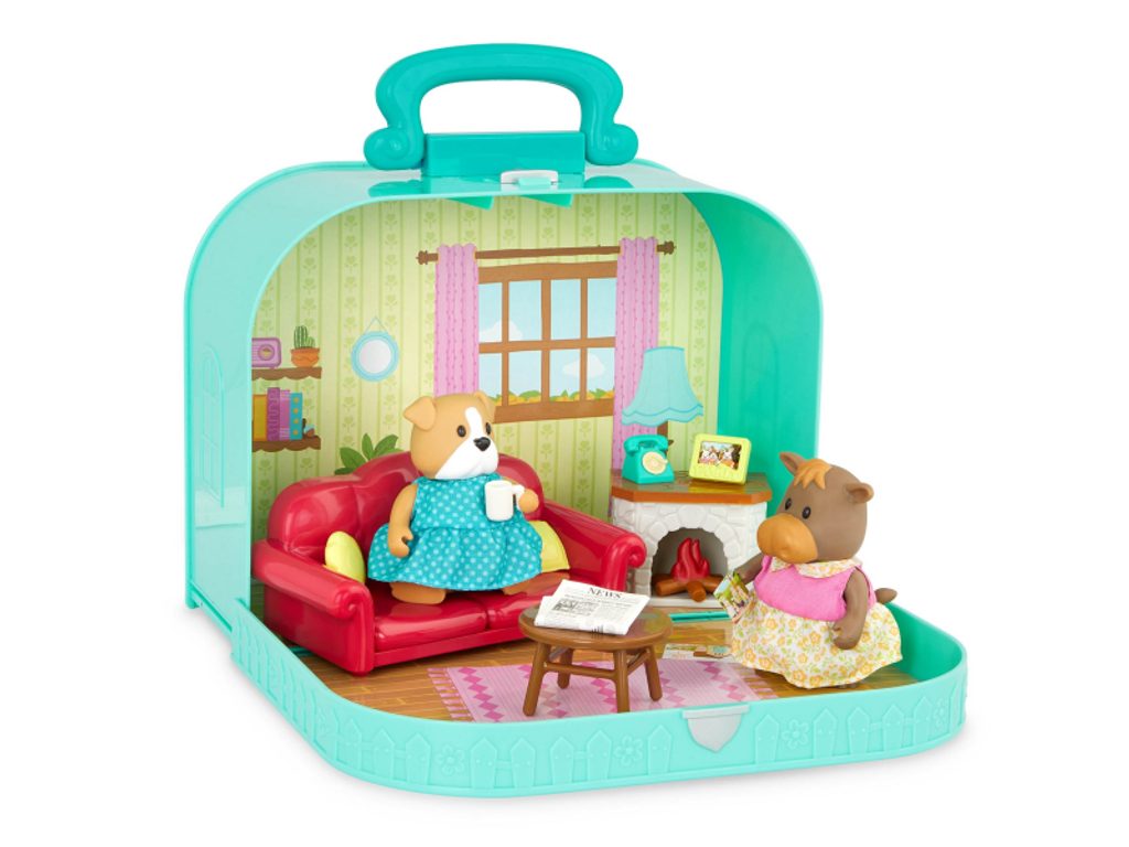 Cestovní sada hraček Li'l Woodzeeze v praktickém kufříku umožní vašemu dítěti hrát si se svými oblíbenými postavičkami kdekoli na dovolené, výletech či během víkendu u prarodičů. Kufřík se po otevření promění v bohatě vybavený obývací pokoj s nábytkem, doplňky a postavičkami buldoka Avy a losice Eloise.
