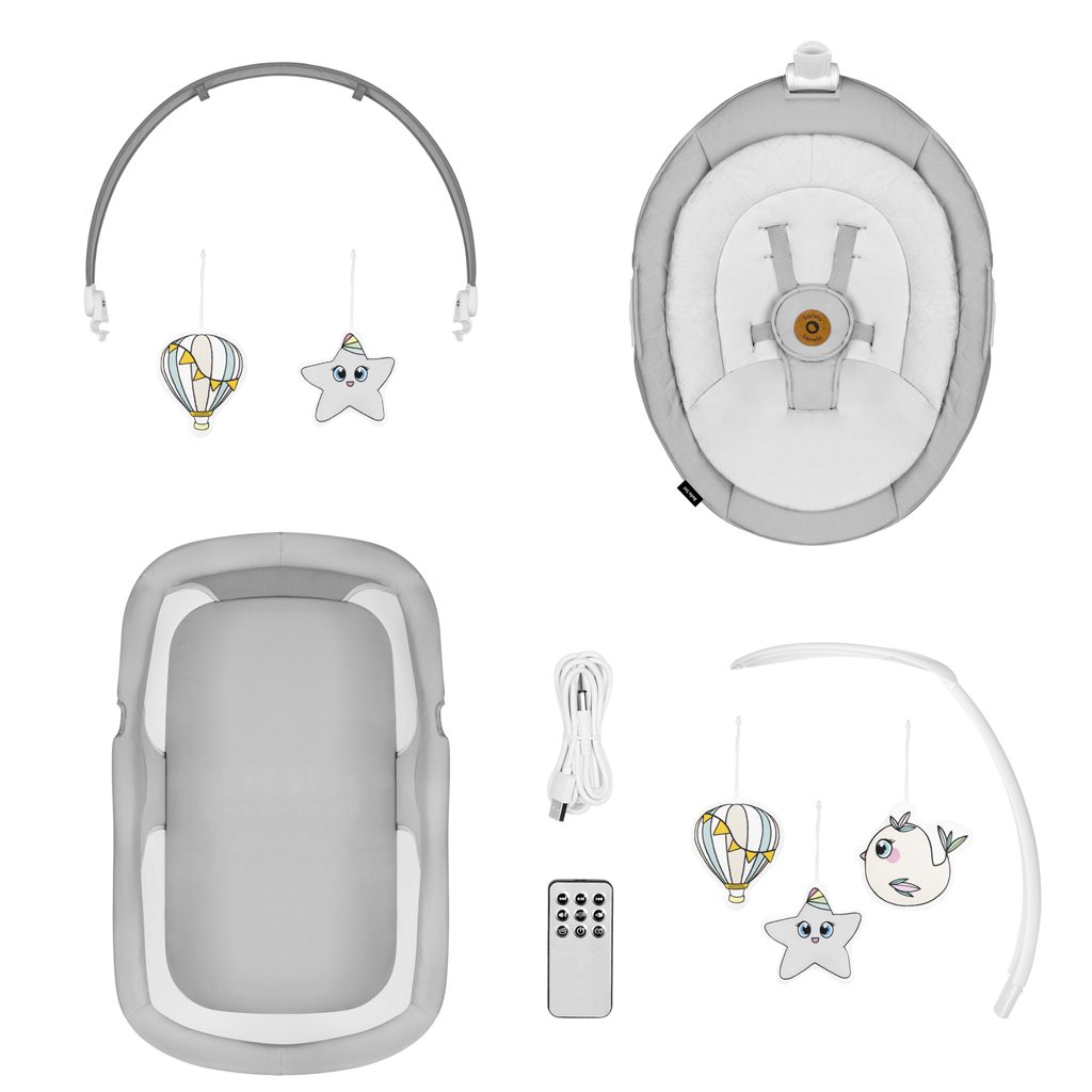 Houpačka je vybavena mnoha užitečnými funkcemi, které usnadňují život rodičům. Noční režim zajistí, že výrobek začne pomalu zpomalovat, až se úplně zastaví, když dítě usne. Automatický detektor pohybu spustí houpání a hudbu, když se dítě začne převalovat. Všechna nastavení zařízení můžete ovládat z dotykového ovládacího panelu nebo na dálku pomocí dálkového ovládání. Tento model přehrává 12 klidných melodií s regulací hlasitosti.