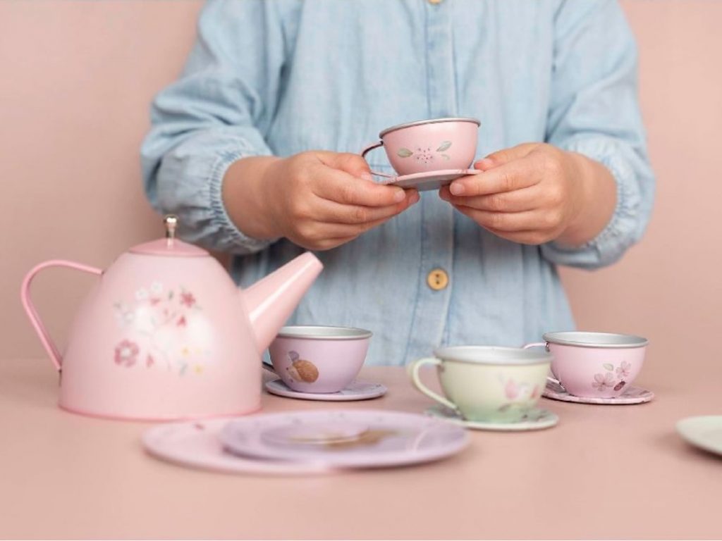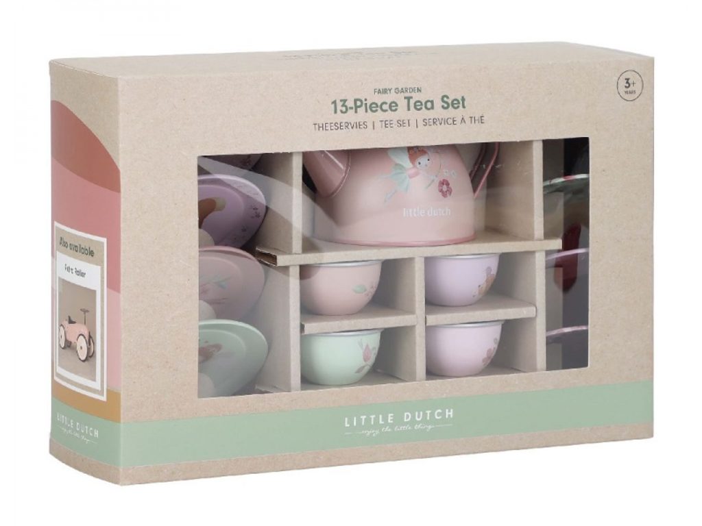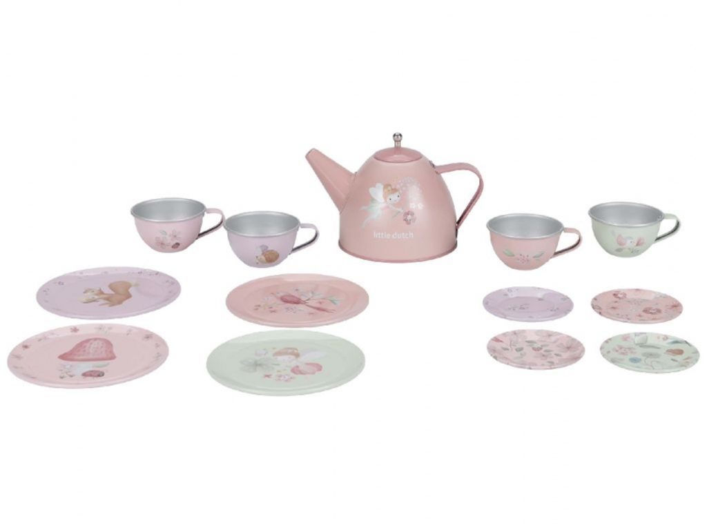 Tato neodolatelná sada čajové konvičky a čtyř hrníčků s podšálky v kvalitním kovovém provedení s jemným potiskem zahradních motivů nadchne každého malého hostitele či hostitelku. Je ideální pro pořádání kouzelného čajového dýchánku s panenkami nebo kamarády. 13dílná sada je součástí designové kolekce hraček a doplňků Little Dutch Fairy Garden, inspirované krásou a životem na zahradě.