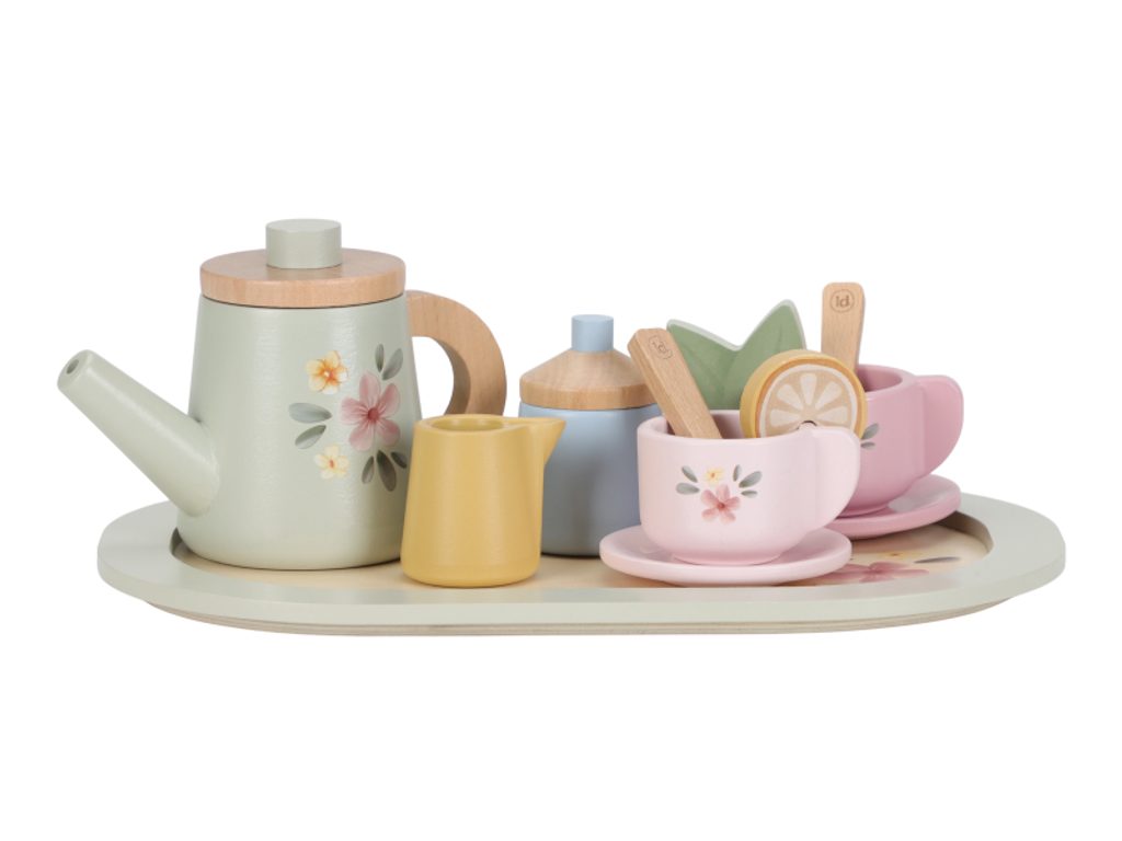 Pozvěte kamarády, plyšáky nebo panenky na čaj o páté! Tato roztomilá dřevěná čajová sada obsahuje vše potřebné pro stylové pohoštění. Děti mohou podávat čaj s mlékem, cukrem, plátkem citronu nebo lístkem máty – zkrátka jako při skutečné návštěvě. Sada podporuje hru na role, rozvíjí fantazii i jemnou motoriku a zároveň vytváří prostor pro společné chvíle plné představivosti. Skvělý doplněk do každé dětské kuchyňky nebo herny. Obsah balení: dřevěná konvička s poklicí, konvička na mléko, cukřenka s pokličkou, tác, 2 šálky, 2 podšálky, 2 lžičky, 1 plátek citronu, 1 lístek máty Vyrobeno z odolného FSC® certifikovaného dřeva. Vhodné pro děti od 2 let.