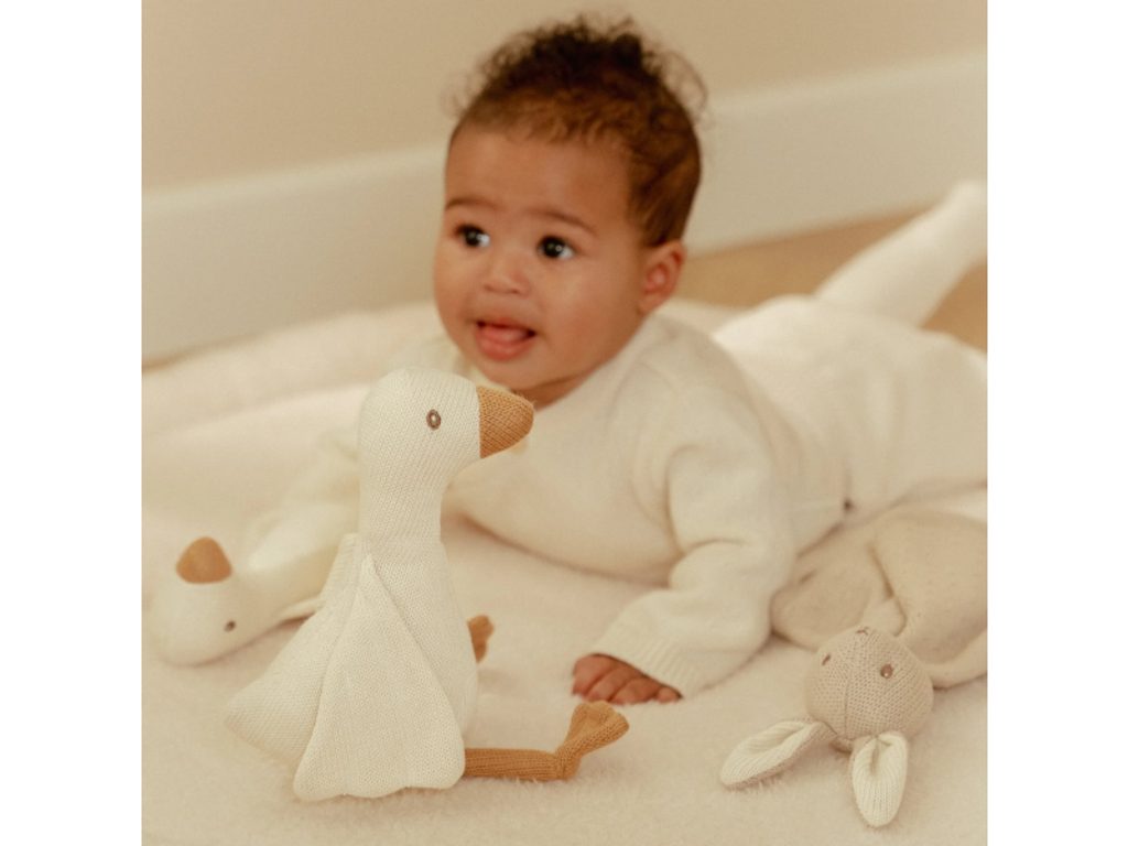 Krásná dárková sada hraček z jemné pleteniny je ideální jako dárek pro novorozené miminko. Sada obsahuje muchláčka s králíčkem a dvě hračky v podobě husy. Vyrobeno z jemných, příjemných materiálů v přírodních tónech Ideální velikost a měkkost pro novorozence Stylové balení – připraveno jako dárek pro miminko i jeho rodiče Sada je součástí designové kolekce hraček Little Dutch Newborn Naturals. Rozměry krabice: 27 x 27 x 11 cm Složení: 100% polyester Výplň je vyrobena ze 100% recyklovaného polyesteru s certifikací GRS (Global Recycled Standard). Možno prát v pračce na jemný program při 30°C. Vhodné pro děti od narození.